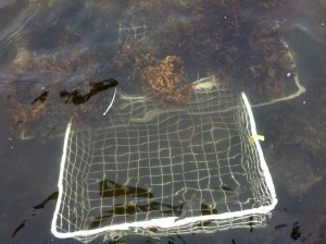 Tången är fäst på trådbacken. Korgen bredvid fylls sedan med sten för att hålla ställningen på plats under höstens stormar.