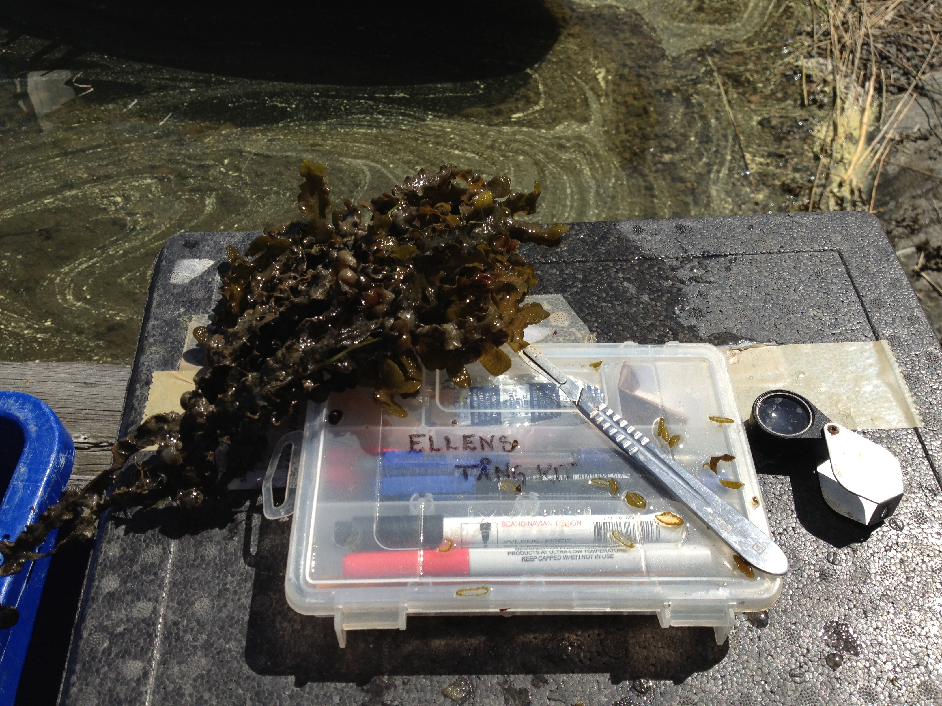 Första dagen på kursen var vi ute i fält och samlade in alger. Vi började på piren vid Aebeltoft färjeläge, där solen sken och det var vindstilla på insidan. Jag passade på att ta årets första dopp utan torrdräkt i nordiska vatten. Det var uppfriskande 16 grader och jag låg nog i vattnet omkring tio minuter och samlade material. Här växte fyra arter Fucus; spiraltång (Fucus spiralis), blåstång (Fucus vesiculosus), ishavstång (Fucus evanescens) och sågtång (Fucus serratus). Jackpot!