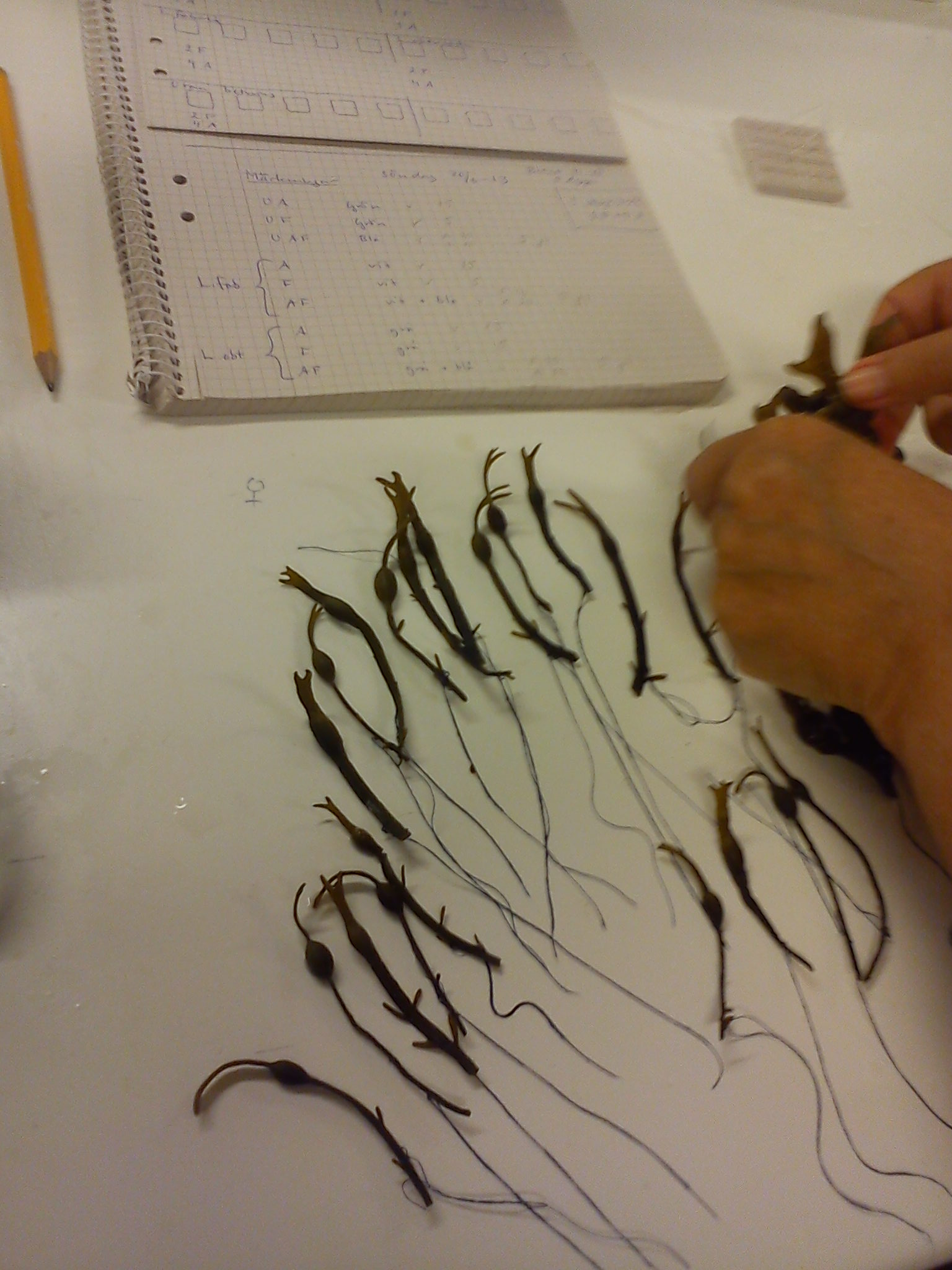 Jag har fått delta i spännande delar av det större projektet som utförs både på Askö och Tjärnö. Vi sydde t.ex. fast trådar i skott av betade tångplantor för att identifiera dem senare. Visste ni att grön, grå och blå tråd ser exakt lika ut när de är våta? Så även gul, vit och rosa tråd. Små saker att tänka på när man gör fältstudier…