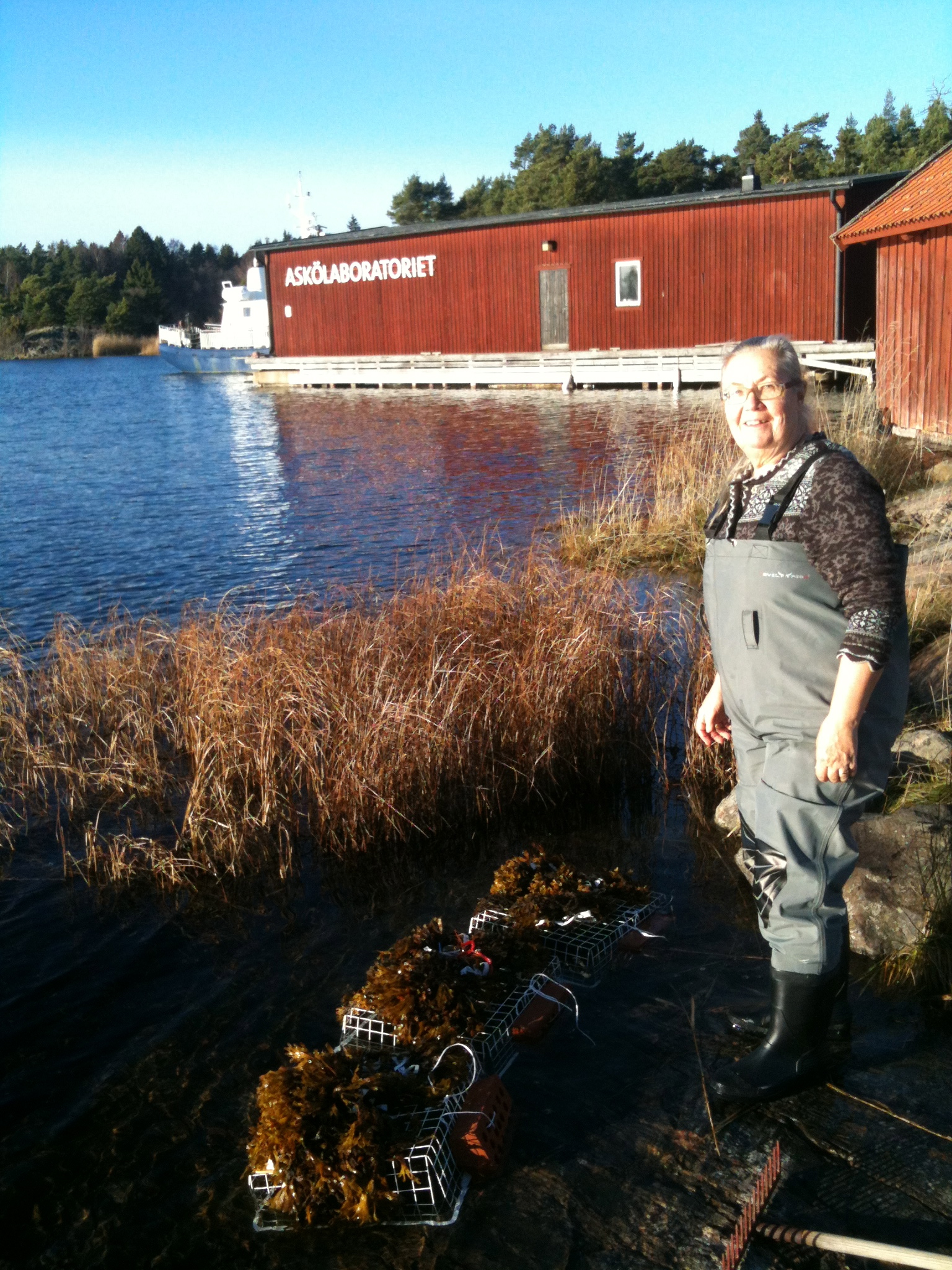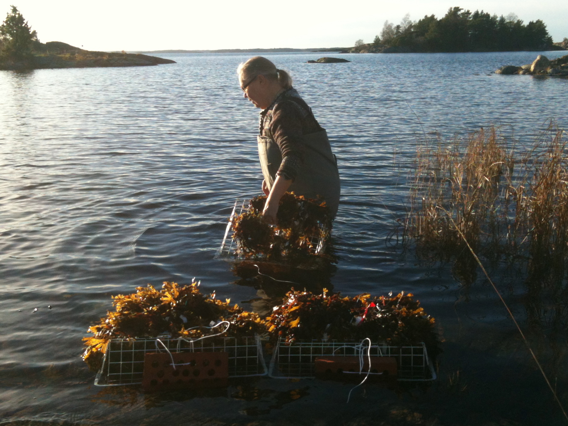 I måndags var det dags att se till att få ut tången i havet för att övervintra. Efter lite olika försök att göra detta inne i Experimenthallen på Askölaboratoriet med extra belysning och luftning har det visat sig att det är svårt att få till tillräckligt bra vattenomsättning och vattenrörelse för att få tången att må bra. Den blir skör och faller sönder på våren. Däremot fungerar det utmärkt att knyta fast plantor på nätburar och ställa ut dem på botten på några meters djup.