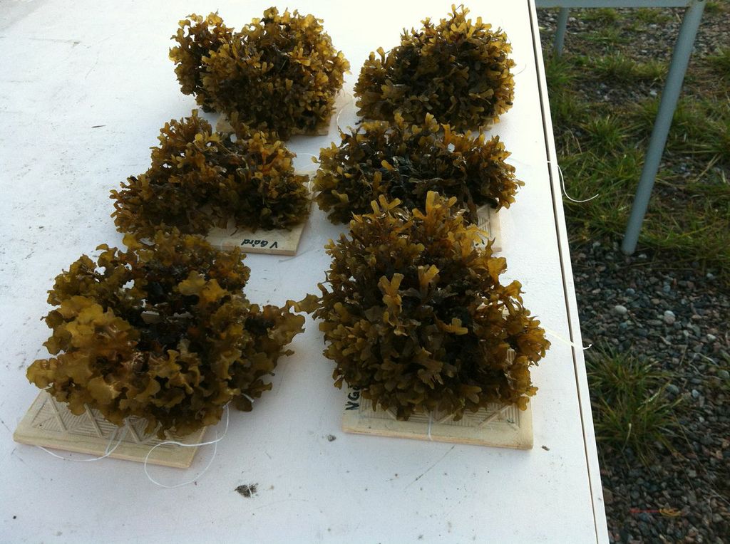 Enligt litteraturen så förökar sig inte dessa och jag har aldrig sett förökningstoppar på denna form av blåstång. Såklart samlade jag in ett större antal tångbollar. Eftersom jag glömt ta med en plastpåse, (det är något som en sann marinbiolog alltid skall ha med sig), så fick jag gå tillbaka till hotellreceptionen och be att få en plastpåse. Dagen därpå åkte jag ut till Askö och knöt fast dem på små kakelplattor. Det vi vill testa är om tångplantor bara de sitter fastknutna så att det finns ett upp och ett ner, kommer de att anlägga förökningstoppar till våren. Nu är det utplanterade och det är bara att vänta tills solljuset och värmen kommer tillbaka till våren, då är det dags att dyka ner och hämta upp dem och se om de anlagt förökningstoppar.