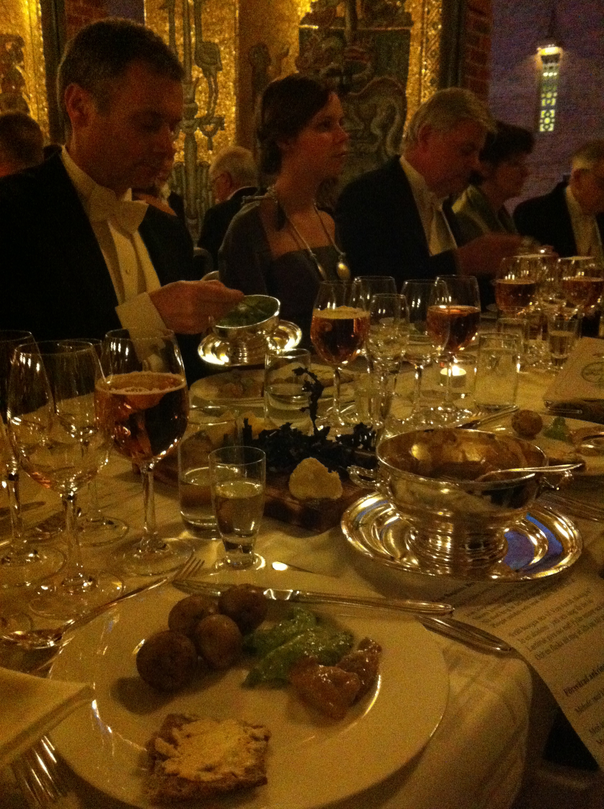 Som aptitretare serverades Vågskvalp i örtlöv, vilket bestod av burfångad stekt havskräfta och Nobissås, omfamnad av ostronörtblad. Till denna läckerhet serverades Castillo Perelada Brut Emporadà från Spanien.