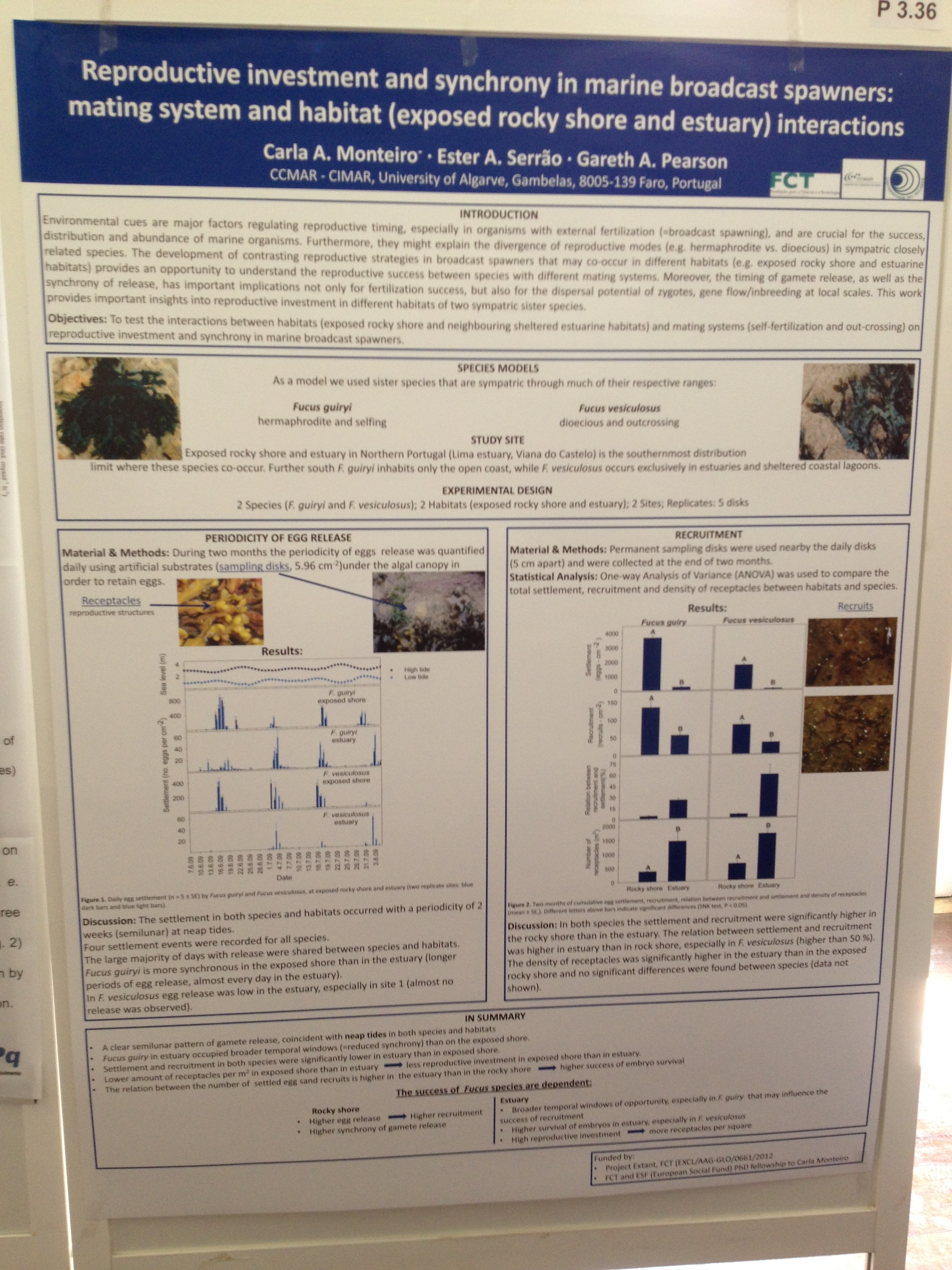 Maria Klein,en av Esther Serrao’s doktorander från Faro, berättar om sitt doktorandprojekt som handlar om hur fisklarver rekryteras och sprider sig. Hon har arbetat med den lilla fisken Lepadogaster lepadogaster (dubbelsugare)i den marina delen av Arrabida natural park, som vi besökte igår. Genom att undersöka det genetiska släktskapet kan hon jämföra släktskapet mellan olika populationer och se hur släktskapet fluktuerar, så att de vissa år är mer genetiskt skilda, medan andra år är de nära säkt (de nya individerna, alltså). Hennes forskning visar att de inte kan dela upp populationen från Lissabon och de från Arrabida i två populationer, de parar sig för mycket med varandra, så de får istället klassas som en stor population. Detta visar på behovet av att skapa ett sammanhängande nätverk mellan MPAs . (Marine Protected Areas).