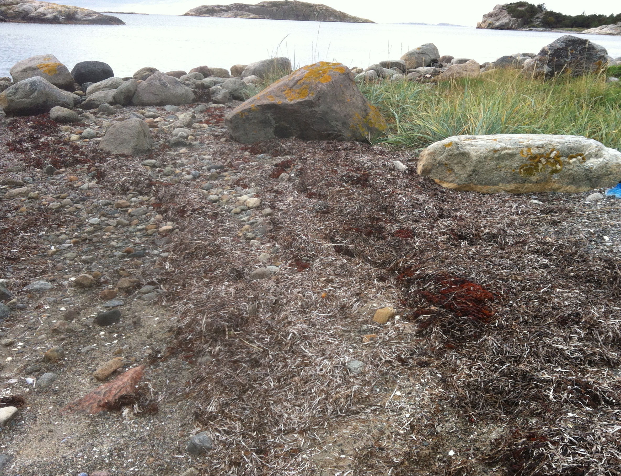 Driftvallen en bit upp på stranden är fylld med torkat ålgräs (Zostera marina) som spolades iland senast när det blåste. Detta sker varje höst när mycket av årets tillväxt lossnar och spolas iland. Ålgräs användes förr i världen som tätningsmaterial i väggar.