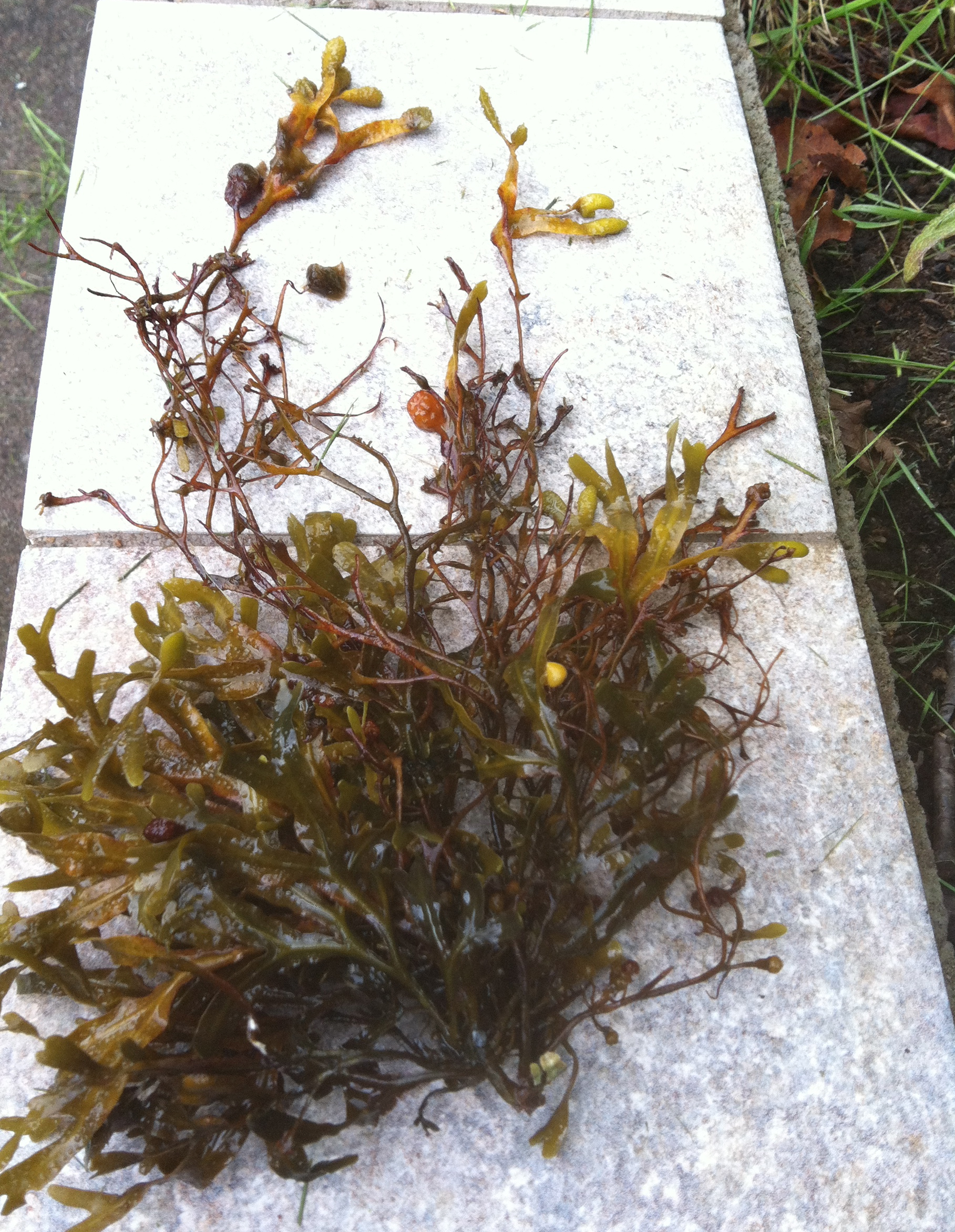 På plantan som ligger på stenplattor syns nya förökningstoppar på de gamla längsta grenarna. Några små tångplantor var också helt överväxta av två olika arter av kolonibildande sjöpungar. Botryllus schlosseri kallas blomsjöpung på svenska och ser lite ut som en oregelbunden formad blomma. Den andra arten Botrylloides sitter individerna i längre slingrande band. Den ser också mörkare ut. Båda kan täcka stora ytor och växter över tångplantor, på stenar och skal. Detta är helt klart ett lyckat år för dessa två arter av sjöpungar. Har aldrig sett så mycket av dem växande överallt på grunt vatten.