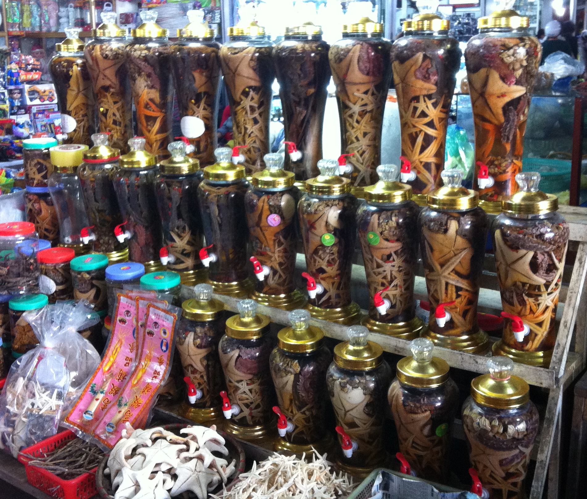 Måste få visa en bild på inlagda långhalsar på burk i ett basarstånd i Cat Ba. Eller denna bild från basaren där det fanns allt från sjöstjärnor till ödlor i sprithaltig dryck. Bara att tappa från de små kranarna i botten på flaskan. Ser lite ut som tomteluvor på långt håll och med svaga ögon.