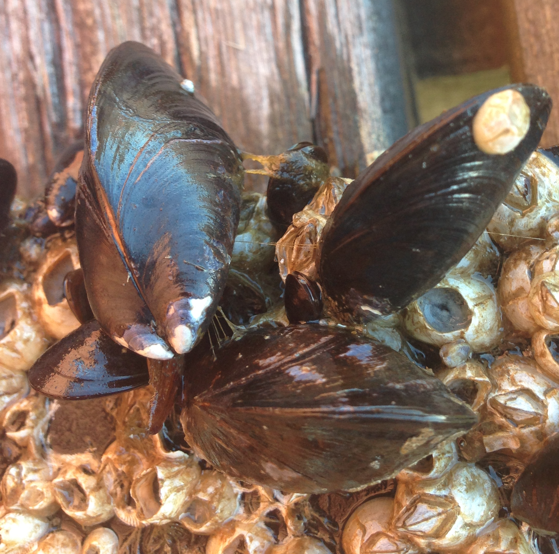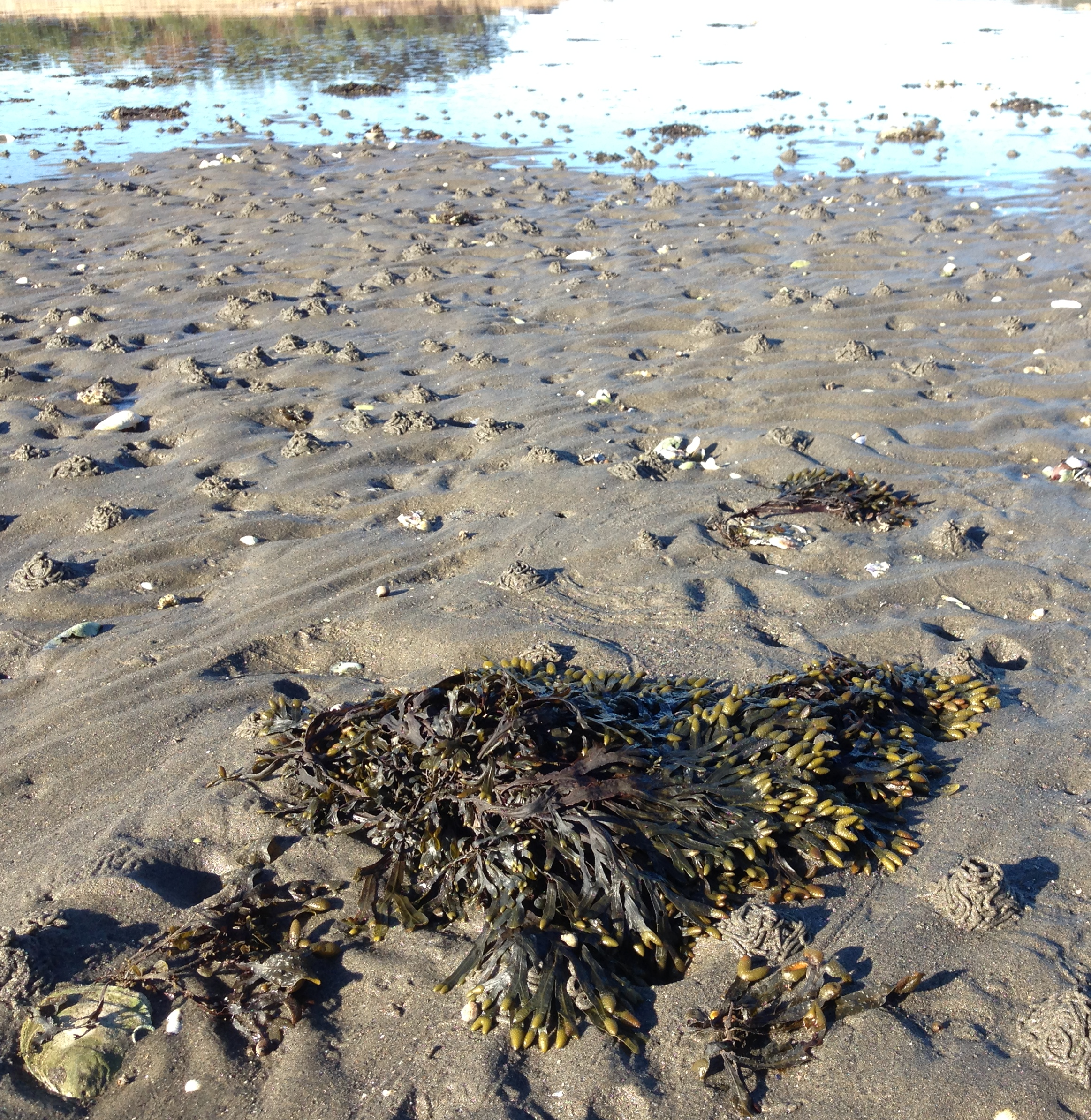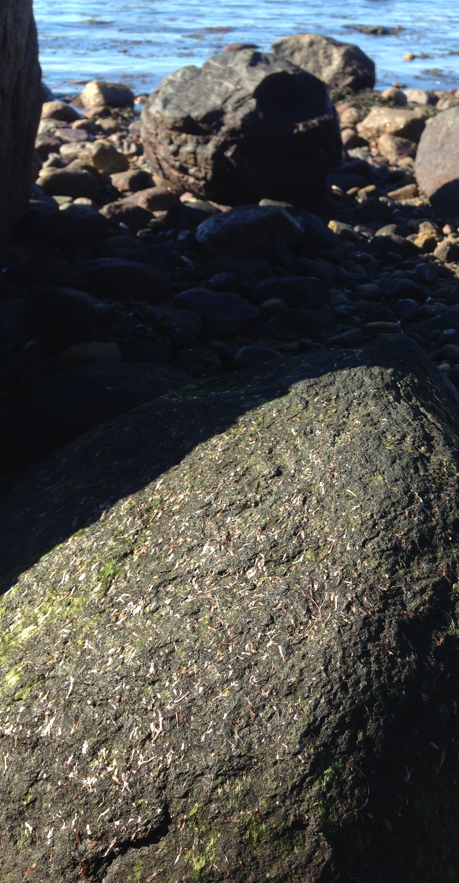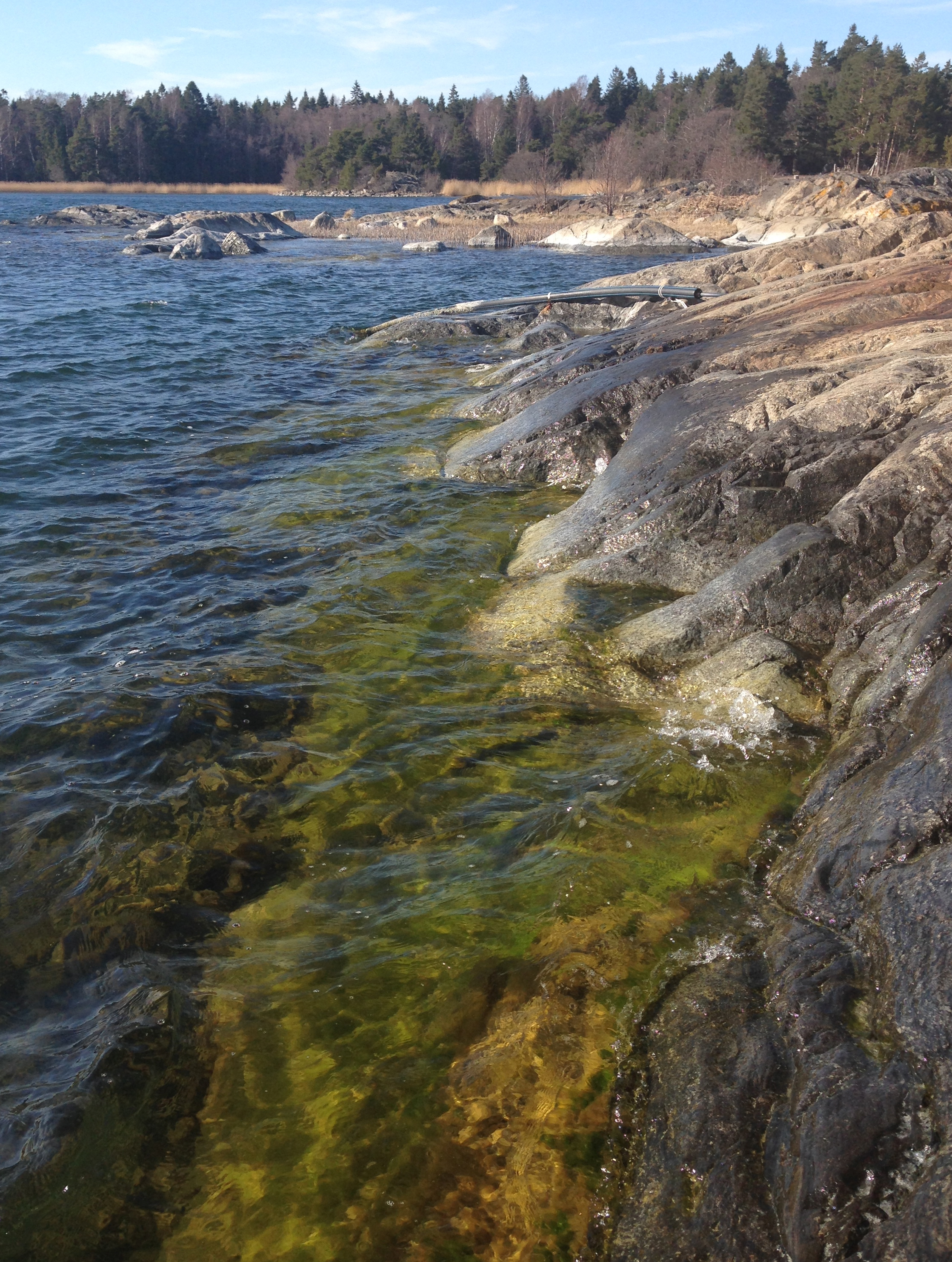 I zonen där vågorna rullar in var stenblocken härligt knallgröna av olika arter av grönalger som är typiska så här på våren. Längre upp fanns en tångvall som mest bestod av blåstång och rödalger bland annat gaffeltång även kallad kräkel. På några av tångplantorna syntes anlagen till förökningstoppar tydligt. Det är fortfarande kallt i vattnet under 10 grader så det kommer att ta ett tag till innan blåstångens förökningstoppar är mogna och tången kan föröka sig.