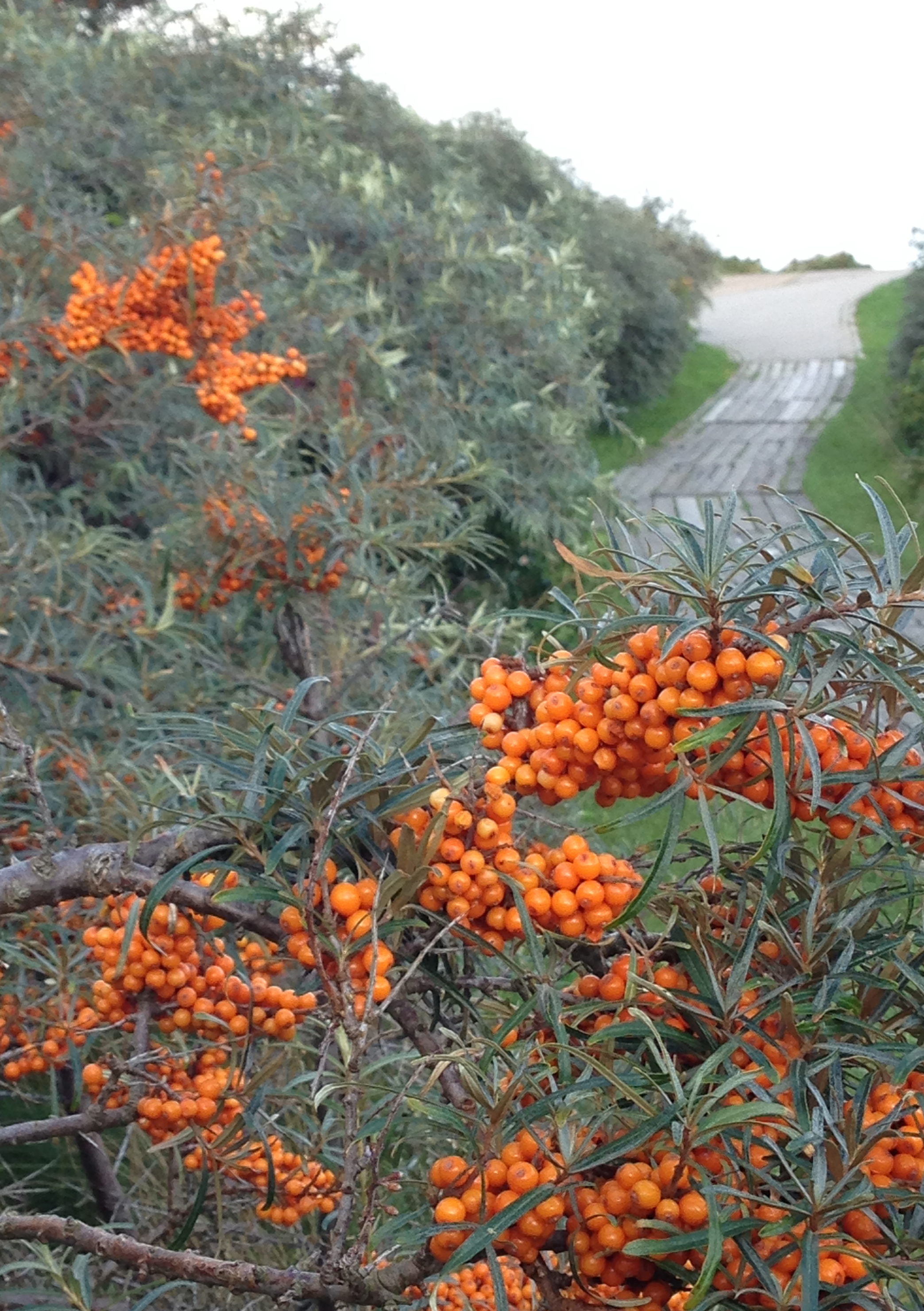 Vågbrytarnas pollare; tripoder är helt täckta med en mörkt rör lite buskig alg. På nära håll liknar den lite Chondrus cripsus, karragentång, men har en massa små papiller som får den att få ett lite risigt utseende. Detta är Mastocarpus mammilaris en rödalg som introducerats till Helgoland och kommer från Island. Det förekommer också Chondrus crispus på klipporna men den skall växa djupare ner. På vägen tillbaka till konferensen hittade vi en stig mellan höga havtornsbuskar fulla med bär. En ren C-vitamin dos för att hålla igång några timmar till och lyssna på mer föredrag.