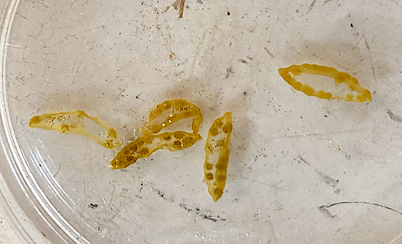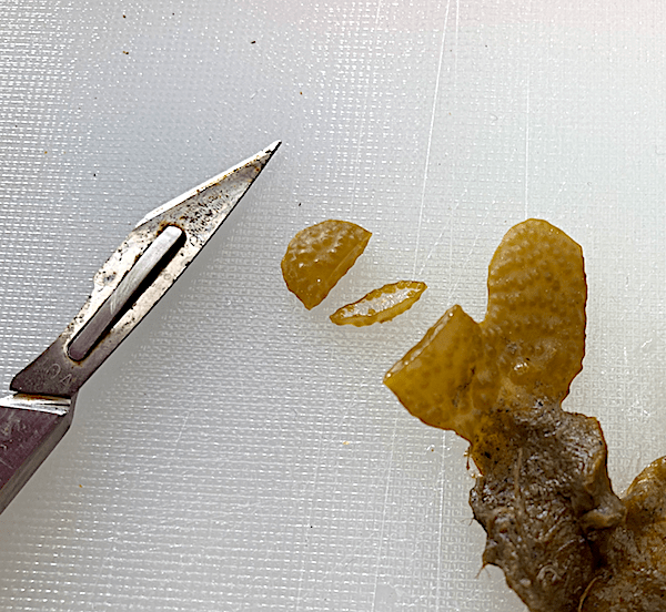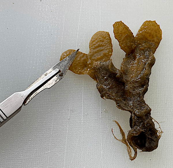 Gör ett snitt som fotot visar. Det går bra med ett rakblad eller en riktigt vass kniv. Det var en hanplanta som har ett kompakt orange innehåll. Det är spermier som ligger tätt packade med 64 spermier per paket. Honplantor är lättast att känna igen för de innehåller paket som kallas för oogon, med åtta ägg/paket. De syns som små olivgröna prickar i en genomskuren förökningstopp.