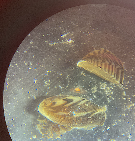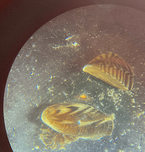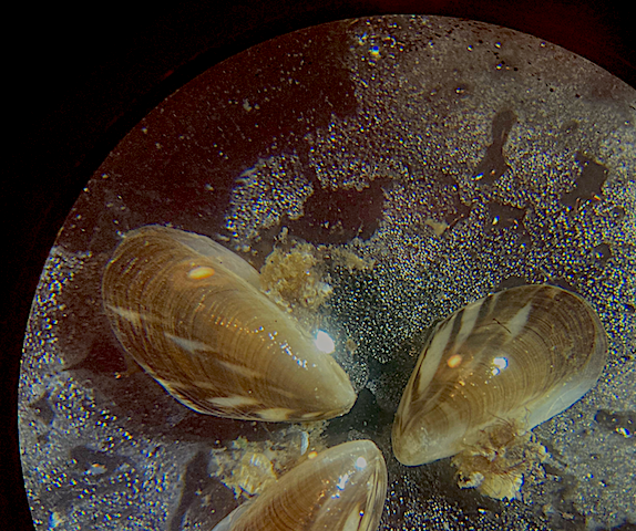 Tre musslor av den trekantiga brackvattensmusslan, taget i lupp. Individerna är ca 0,8 cm stora med vacker teckning på de brunaktiga skalen.