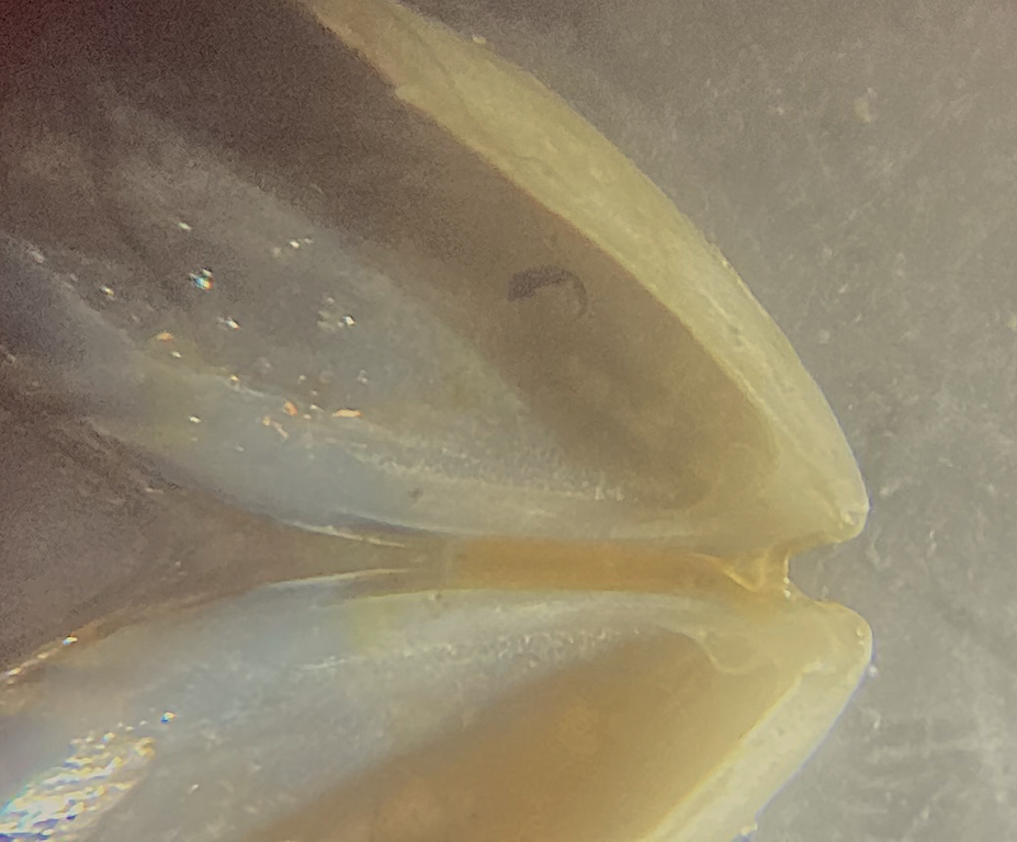 Det är dock inte alltid lätt att se. Fick kolla på flera skal i lupp för att hitta ett tydlig tandlikt utskott.