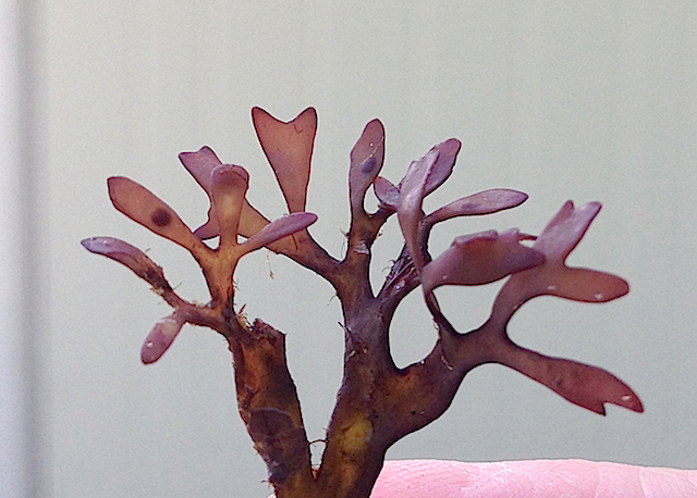 En gametofyt av Chondrus crispus. Två tydliga karposporofyter syns som mörka fläckar i topparna.