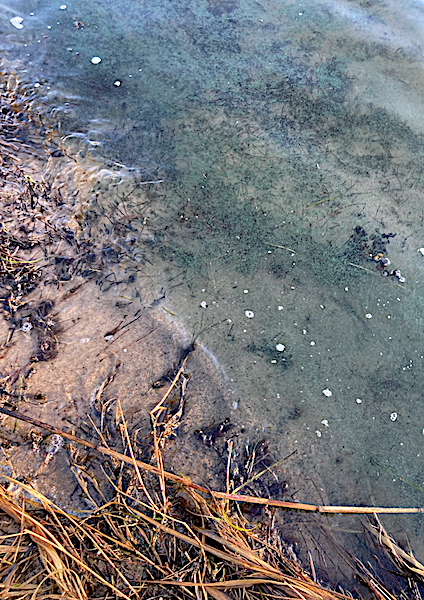 När jag tittar ner i vattnet nära stranden gör jag en upptäckt. Det är en fin vinterblomning av cyanobakterier som ligger och skvalpar i vattnet! Arten är knippvattenblom, Aphanizomenon spp. och såhär års är det mycket mörkt blågröna. De syns tydligt i vattnet, men det gäller att hålla ögonen öppna.