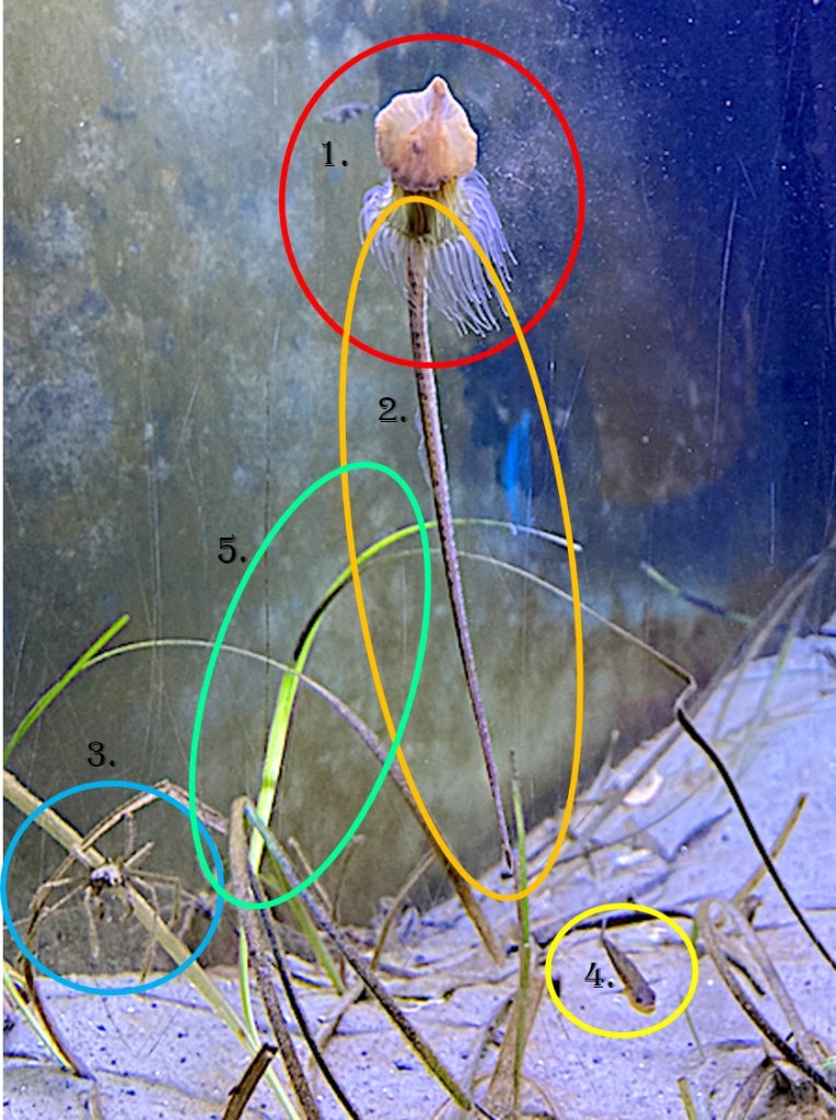 Akvariet visar just habitatet ålgräsäng, med några av dess mest vanligt förekommande arter. Så vill du se dem ute i det vilda så är det till en ålgräsäng du ska bege dig. Men vänta tills det blivit lite varmare i vattnet, för precis som ängen på land så dröjer det till runt midsommar innan ålgräsängen står i full prakt igen.