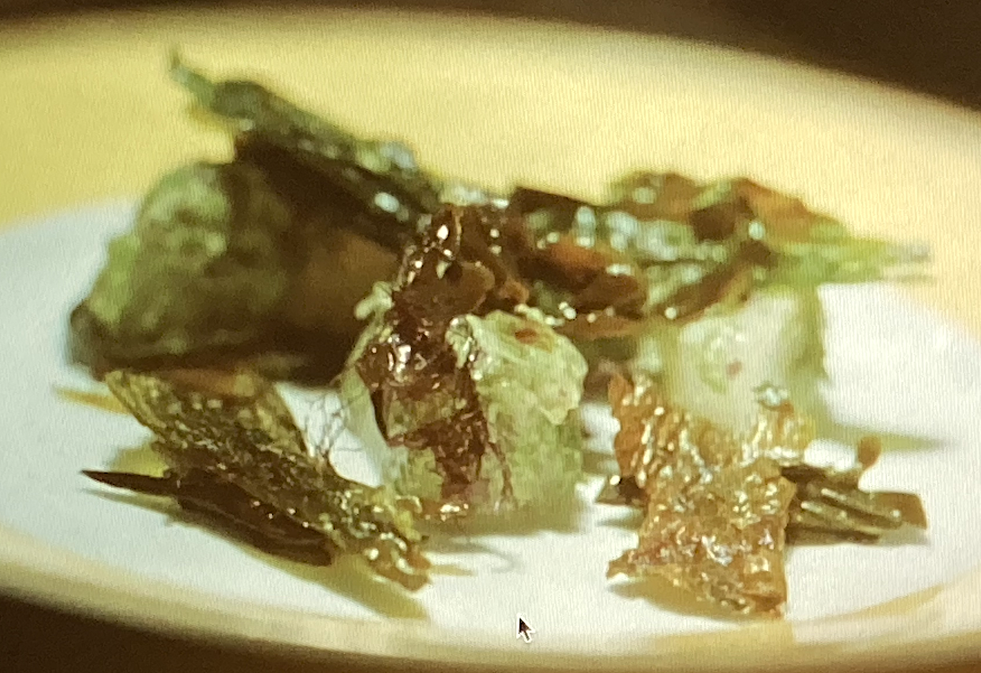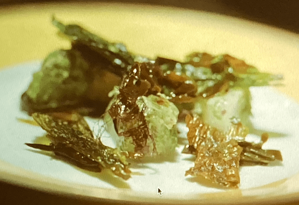 Här syns nori arket som rullats runt ris, fisk och grönsaker. Många små sloke blad På tallriken finns både nori rullad kring avokado och ris och en frasig friterad tarmalg mitt på tallriken.