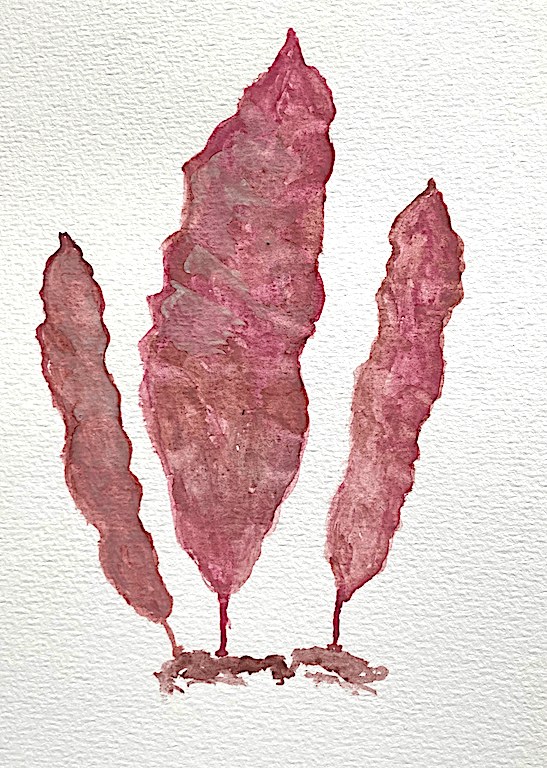 Vi startar med en rödalg, Grateloupia turuturu, som inte fått något svenskt namn ännu. På engelska heter den Devil´s tongue weed, på norska Djevel-tunge. Att den fått namnet ”Devil´s tongue weed” beror nog på att den liknar en röd till rödbrun långsmal tunga. Algen växer ut ifrån en liten fästskiva med 1-6 stycken brett lansettlika, ljusa till mörkt rödbruna blad. Bladen blir ca 60 cm långa och 2- 20 cm breda. De är lite slemmiga och mjuka. Kanten på bladet kan vara lite vågigt men de kan också bilda små utskott, vilket ses som blad i kanten på det stora bladet. Arten växer bra i näringsrikt vatten, den verkar föredra mellan 22 till 37 promille salthalt men kan överleva 12-52 promille salthalt och klarar temperaturer mellan 4-29°C.