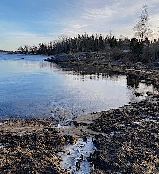 Sjöängen på Rådmansö, med ett litet dike där smältvatten rinner ut i havet.Skal av snadmussla, hjärtmussla och dammsnäckorSkal av trädgårdssnäcka ibland löv och tång.