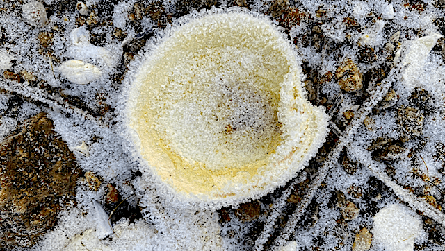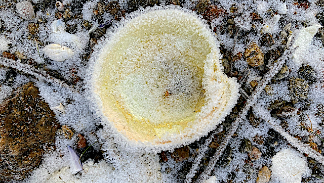 Nu längtar man inte efter att stoppa ner händerna i vattnet som är runt 0 grader eller t.o.m. någon minusgrad. Så det är lätt att nöja sig med att leta efter lite skal in tångvallen. Det är lätt att hitta många olika arter på stranden vid Saltö. Extra vackert blir det med en fin kant av frost på skalen. Arctica islandica, islandsmusslan har stora skal som ligger kvar länge på stranden. Till arter som finns på både ost- och västkusten hör sandmusslan, Mya arenaria och hjärtmusslan, Cerastoderma edule.