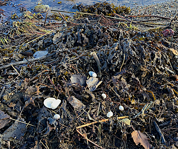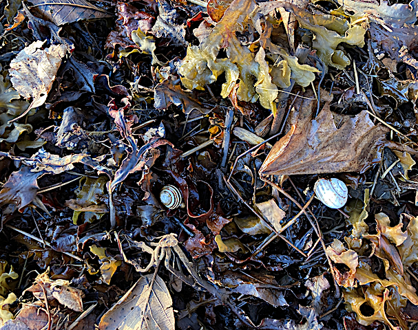 Hemkommen efter nyår till Östersjön och min hemma strand, på Rådmansö, Norrtälje, insåg jag att det låg många skal i tångvallen här också, men i tångvallen var det mycket mer löv och vassbitar. Hittade också några skal av trädgårdssnäckor som ramlat ner och hamnat i tångvallen.