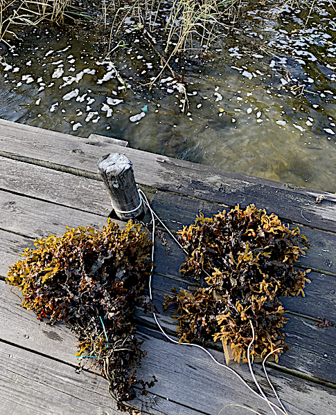 Två tångplantor knutna vid en av bryggpollarna. En tångplanta kollas vad som gömmer sig ruskan.