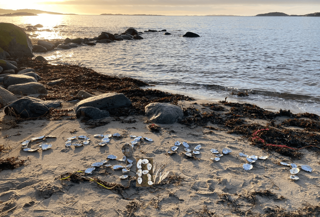 Nyårshälsningen är gjord med skal som jag hämtade från högen och bar ner till stranden. Tyvärr blev det en liten miss i hur många skal som behövdes. Så det sista fick bli ett litet artistiskt tillägg.