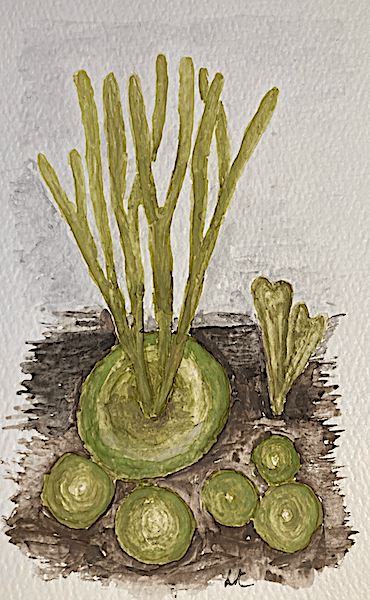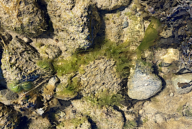 Men i det grunda vattnet syns vårarterna tydligt. De tunna bladen av strutsallat, Monostroma grevillei och liten grönkudde, Acrosiphonia arcta är båda typiska vårtecken vid stränder i Östersjön.