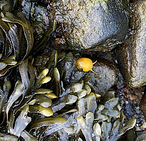 En vackert gul trubbig strandsnäcka är ute och kryper på sanden. Bredvid ligger några plantor av brunbindel, Petalonia fascia, som var Månadens alg- februari 2020 och på en liten sten bredvid har vi en blåstångsplanta.