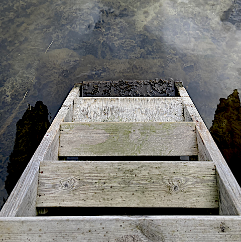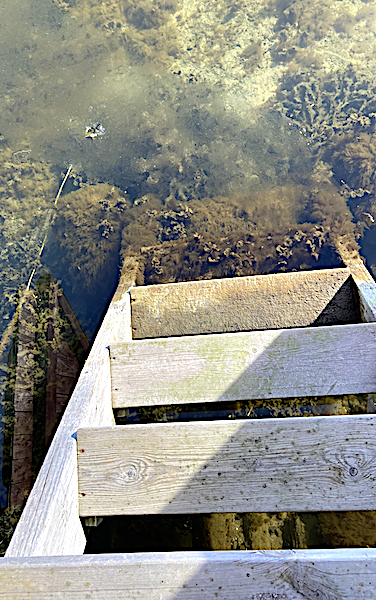Härlig vårvinterdag, spegelblankt och lite is i vattnet.Badtofflor och tång låg innanför dörren och vattnet nådde precis upp till det näst nedersta trappsteget och täcker fortfarande de små nya tångplantorna.
