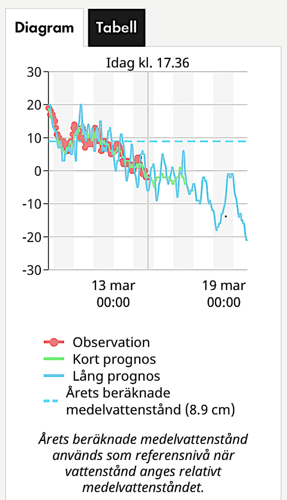 När jag tittade ut på badhyttens trappa den 13 mars var det riktigt lågt vattenstånd, men de nya små tångplantorna sitter fortfarande under ytan. Vattenståndet är nu nära medelvattenståndet för året. Men när jag tittar på prognosen runt den 19e mars kommer det att ligga ca 20 cm lägre och då riskerar de att bli torrlagda. Måste kolla att de klarar sig.