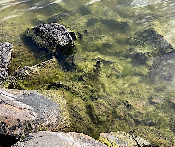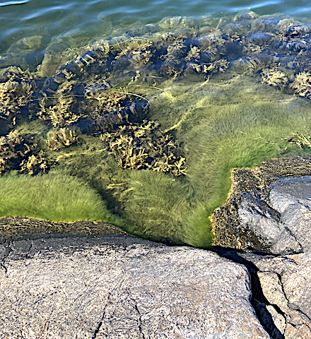 Grönalger som driver runt nu kommer att försvinna – kastas upp på land eller driva bort – beroende på vind och blåst igen. Prova att röra runt med händerna i grönalgerna, både de som är lösa och de som sitter fast på stenar och klippor nära vattenlinjen. Du kommer se att små bubblor sprids från dem. Det är faktiskt syre som de producerat genom sin fotosyntes. Syre som både djuren i vattnet och vi på land behöver. Det är såklart bara en liten del av den syreproduktion som är livsviktig för oss och för vår andning. Kanske ändå något positivt att tänka på om de drivande algmattorna inte är så trevliga att titta på.