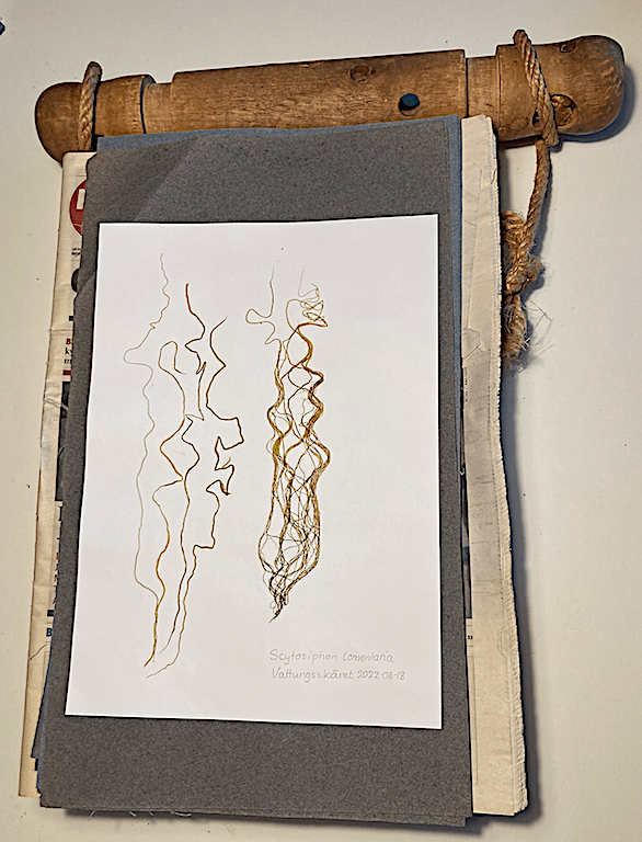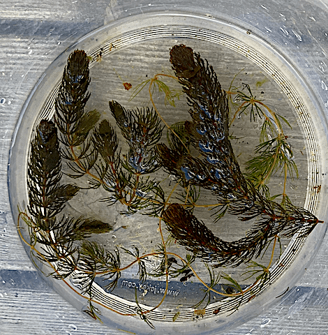 När jag plockat upp slingorna visste jag vad de styva bladen som sitter i kransar var – hornsärv, Ceratophyllum demersum. Färgen var mörkgrön-rödbrun, men kan variera beroende på ljustillgång.