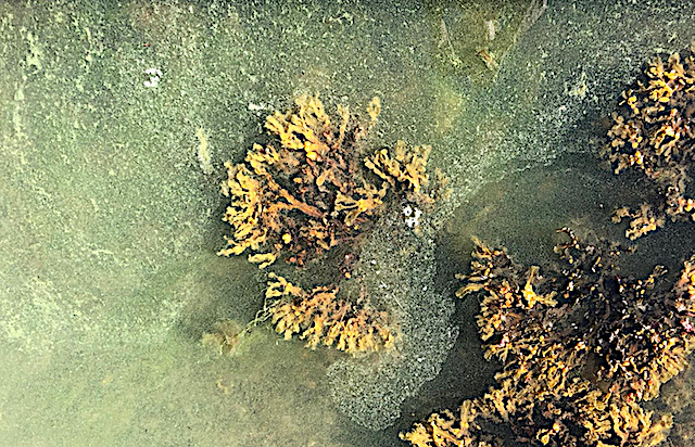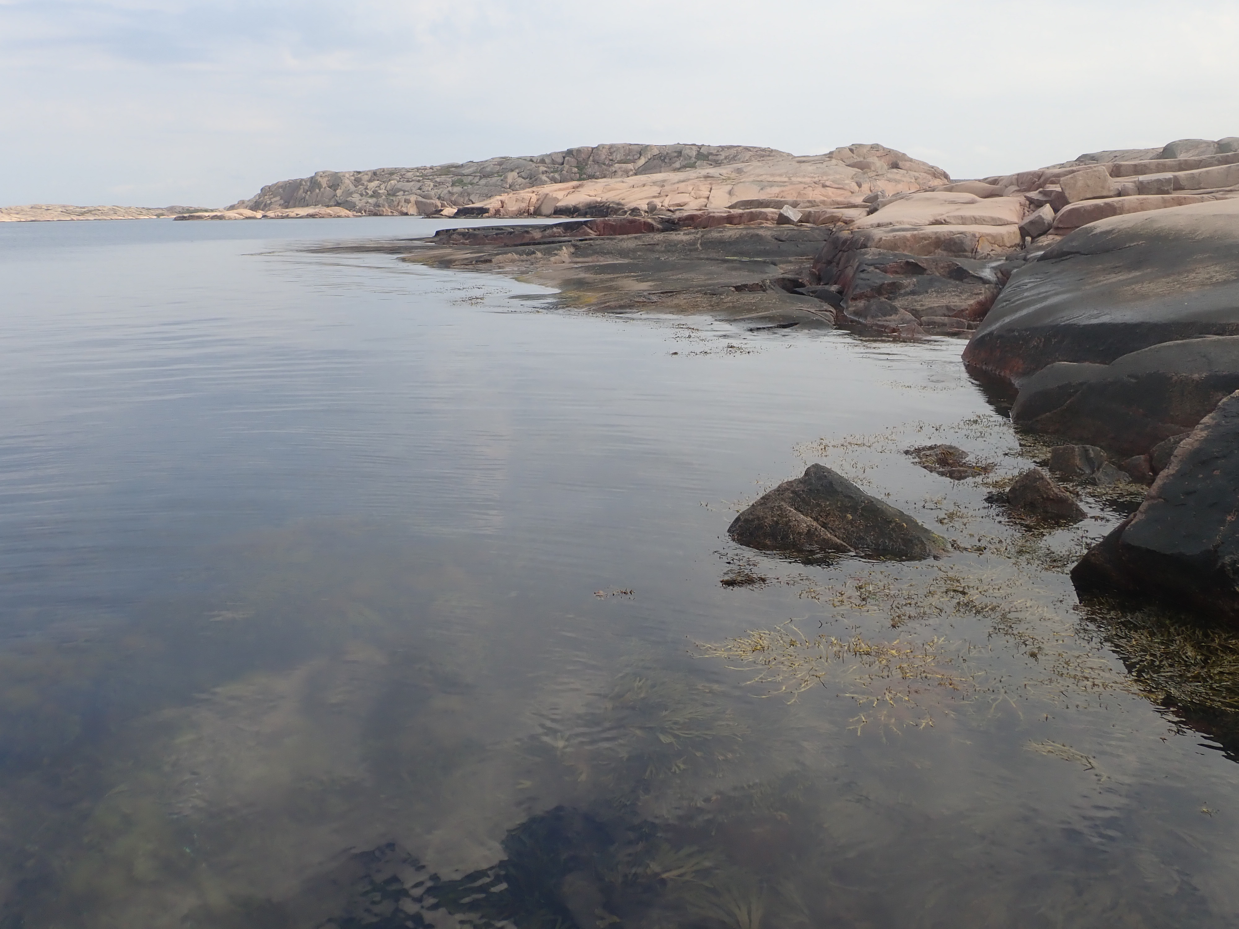På andra sidan av ön ligger ett smalt skyddat sund. Spännande att se vad som kunde växa där! Där fanns inte mycket grönslick utmed strandlinjen. Det såg snarare ut som lite grönt, löst sediment på klippytan. Kunde först inte förstå vad det var som såg ut att stå upp i vattnet direkt från klippan utmed strandkanten. Ser ut som en rotad vattenväxt… Men den kan ju inte fästa sig på klippan?