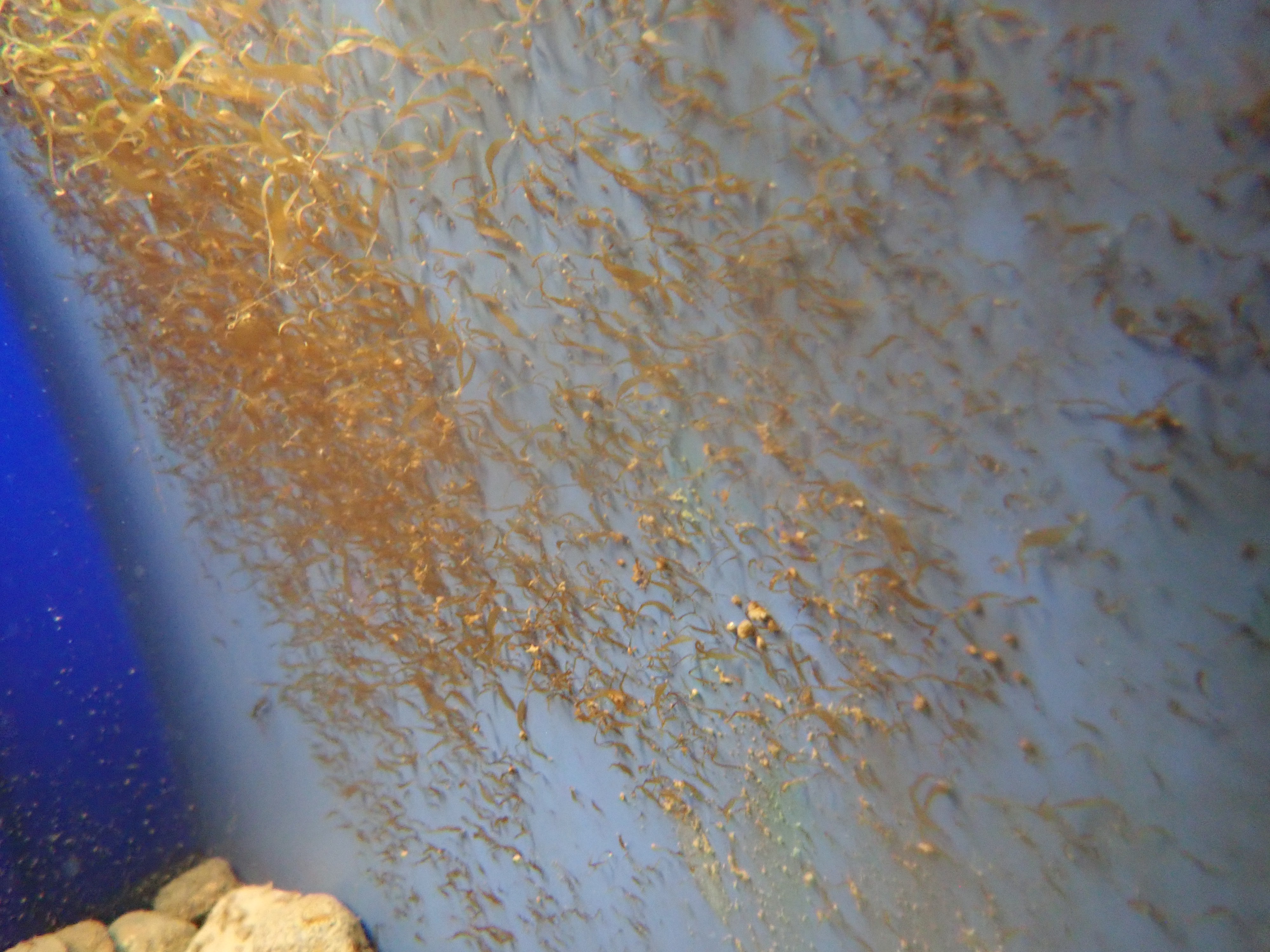 Förra året trodde vi att hela sådden hade misslyckats. Vi såg inga små tarebebisar på stenarna alls. Men efter någon månad upptäckte vi att de alla hade satt sig på kanten av baljan i stället. Några hade till och med satt sig på vattenslangen som sticker ner i lådan. Egensinniga små rackare. I år kommer jag därför så ut dem i en mindre vattenmängd, så att de sätter sig på gruset där jag vill ha dem innan jag fyller på baljorna fullt upp. Det är lite tricks och knep med att odla alger, minsann.