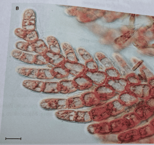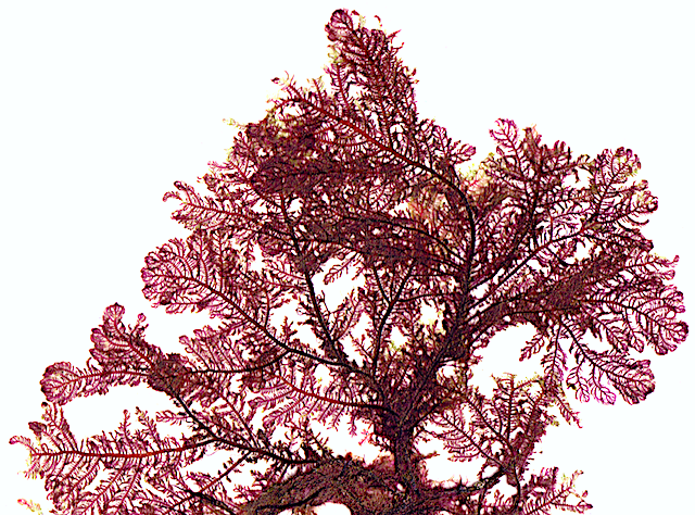 Fotot visar en skottspets av mörk havsfjäder i förstoring. Bilden är från den av oss frekvent använda floran Danmarks Havsalger. Centralcellerna, de som utgör själva ”stammen”, är päronformade och från dessa utgår motsatta förgreningar. På fotot syns även ett par kiselalger som växer som påväxt på skottspetsen, ifall någon mikroalgsentusiast läser Tångbloggen.