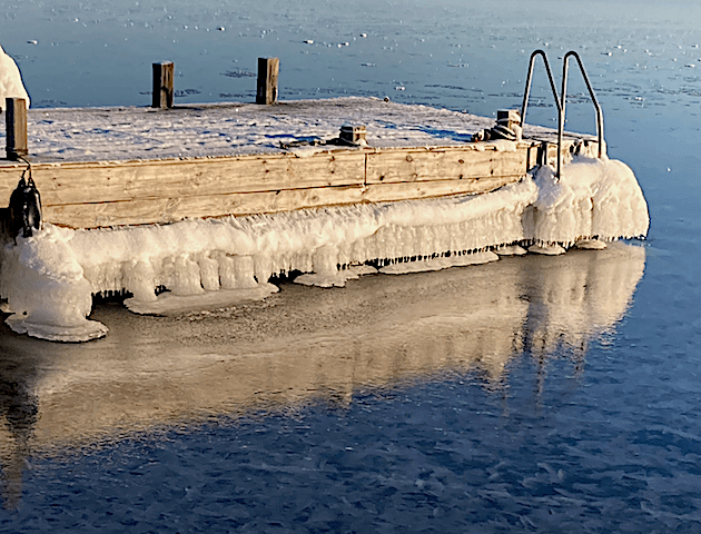 Skulle man vilja ta ett vinterbad är det att åka kana ner på isen. Svårt att ta sig i och ur vattnet om man ens lyckas göra en vak.