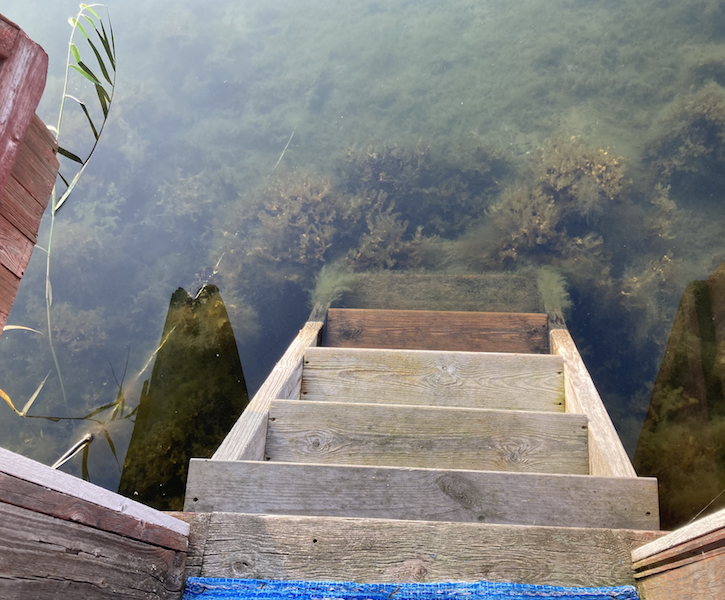 Fastfryst tångplanta vid bryggan.Stegen i badhytten med tång på nedersta steget – inte säker på att det behövs, men fint med tång såklart.