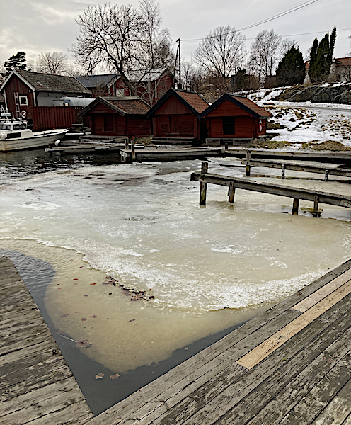 I Räfsnäs hamn ligger det kvar några tjocka isflak, annars har isen nästa försvunnit. Snösmältningen har gjort vattnet brunt av humusämnen och några bruna blad flyter runt i vattnet. Nu när nästan all is försvunnit blev jag lite nyfiken på om det fanns några tångmärlor eller annat som gömmer sig i tångruskan som hänger vid bryggan.