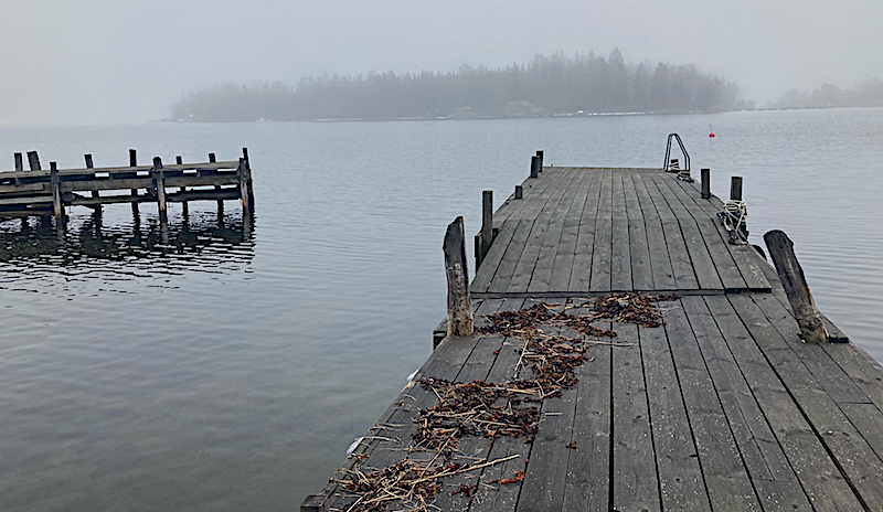 Tunholmen skymtar i dimman utanför bryggan. Blåstången ligger kvar uppe på bryggan efter vinterns högvatten och stormar. Men nu är våren på gång med längre perioder av högtryck och lågvattenperioder.