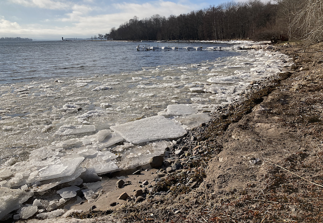 Isflaken driver utmed stranden och skaver på alger och blåstången.