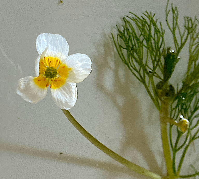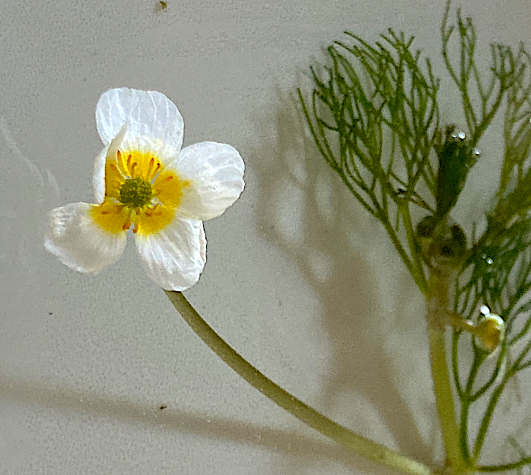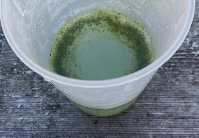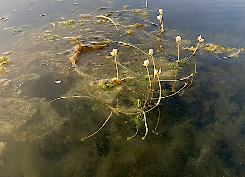 Jag lägger upp den planta som jag just höll på att undersöka djurlivet i på bryggkanten för att mäta storleken. Den var ca 40 cm lång. Det var mest små tångmärlor, båtsnäckor och ovala dammsnäckor i provet denna gång.