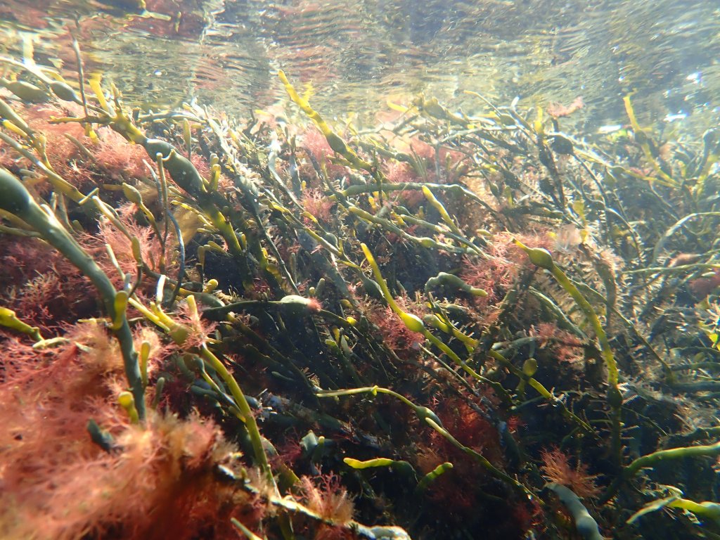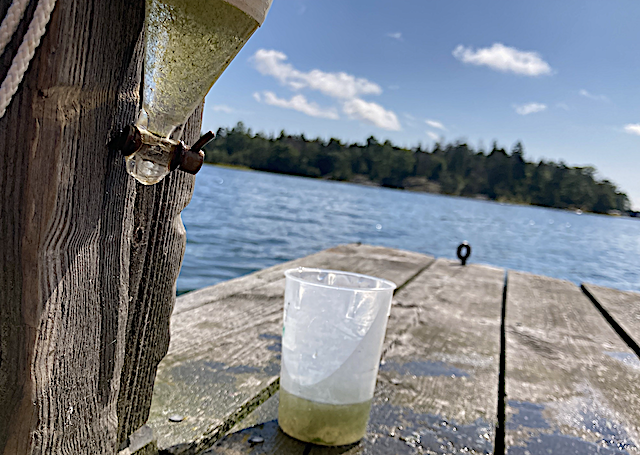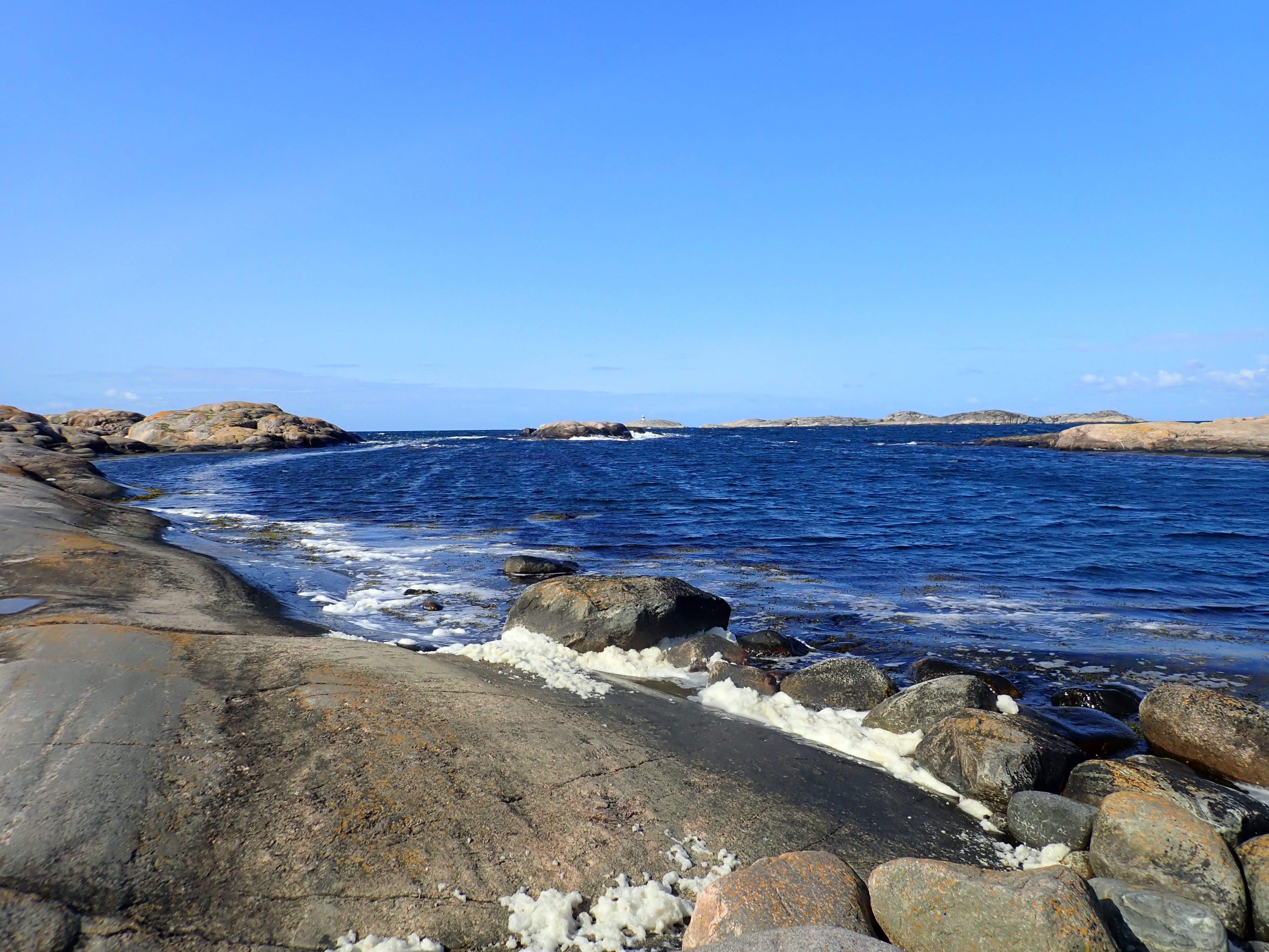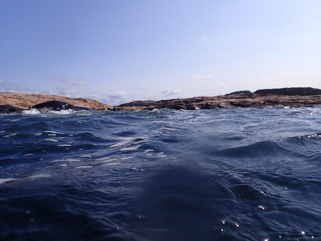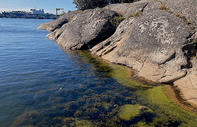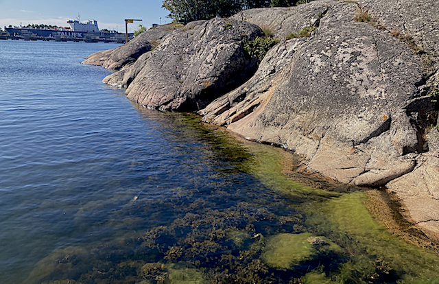 Alldeles vid den stora hamnen i Kapellskär finns en campingplats med badplats och härliga klippor där blåstången frodas. Ett första tecken på att vi närmar oss hösten syns nu. Det är att grönslicksbältet börjar någon decimeter under ytan. Det beror på att vattenståndet har stigit sedan grönslickens sporer satte sig fast strax under vattenlinjen i juni när det var högtryck. Nu när höstens lågtryck kommer in, stiger vattnet och grönslicksbältet hamnar djupare.