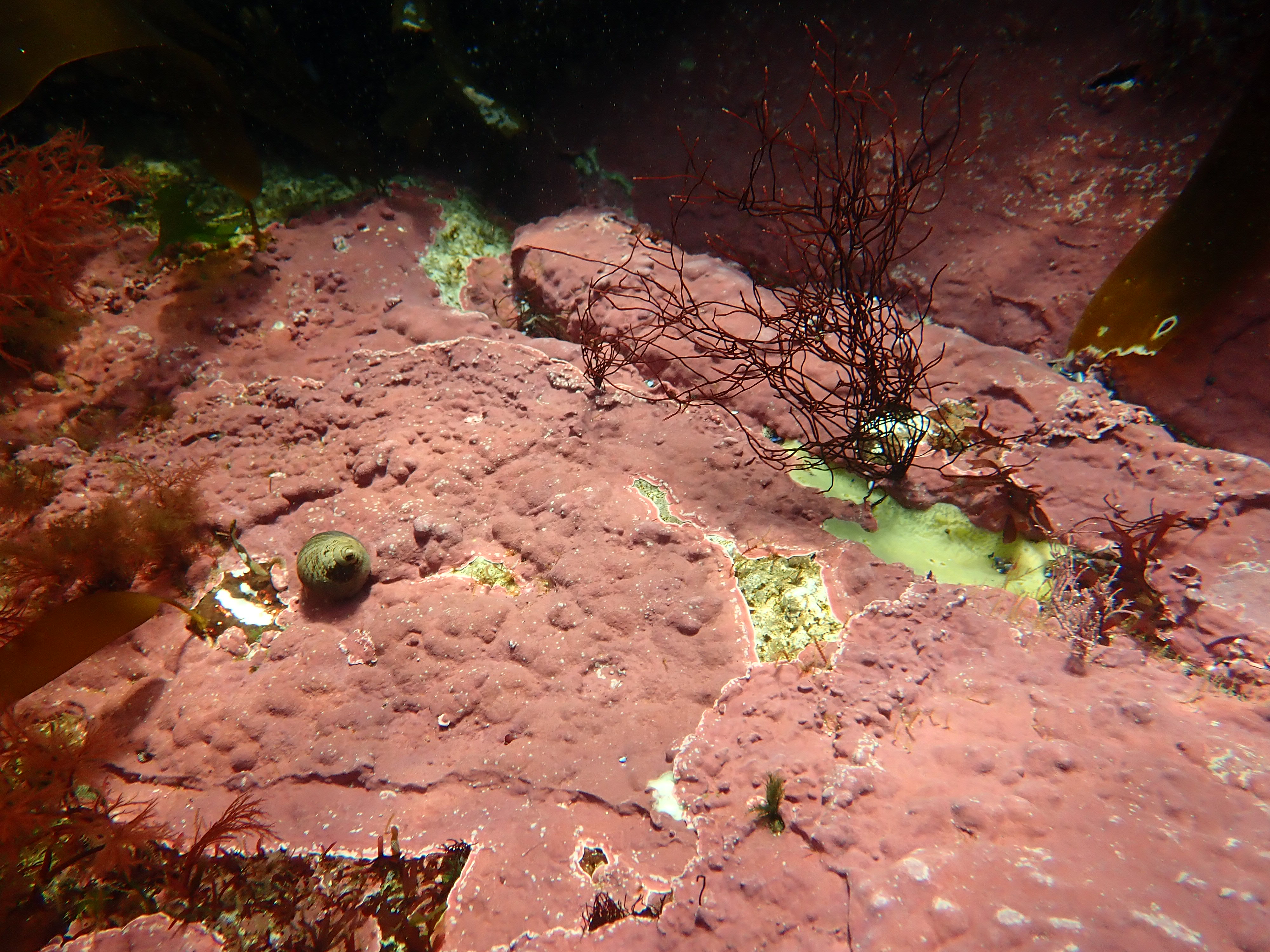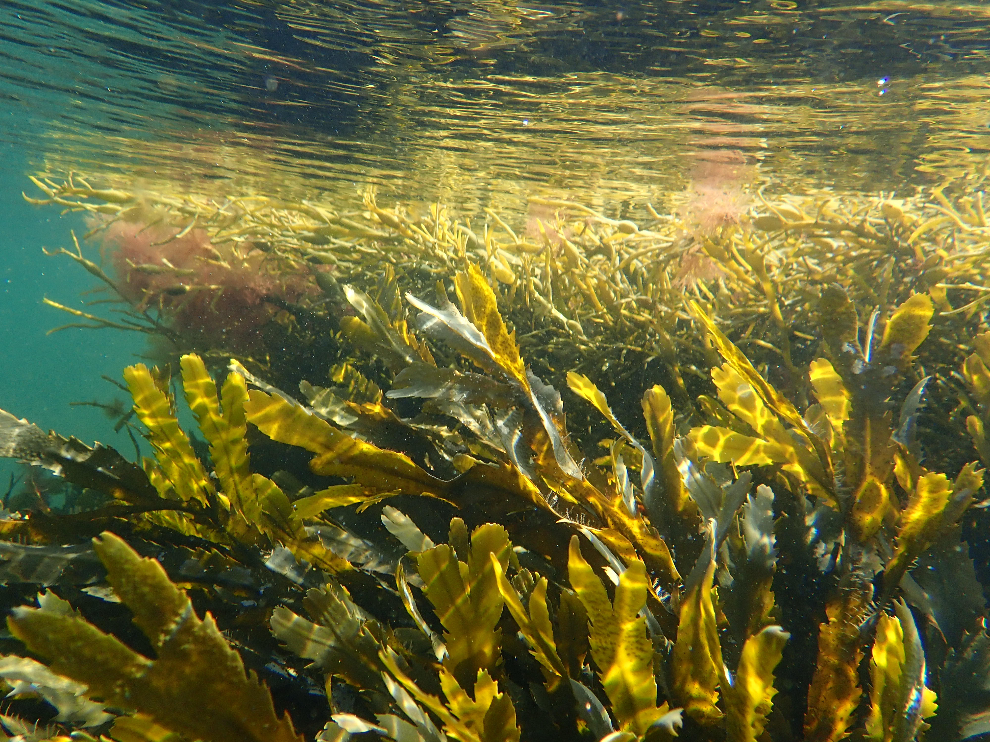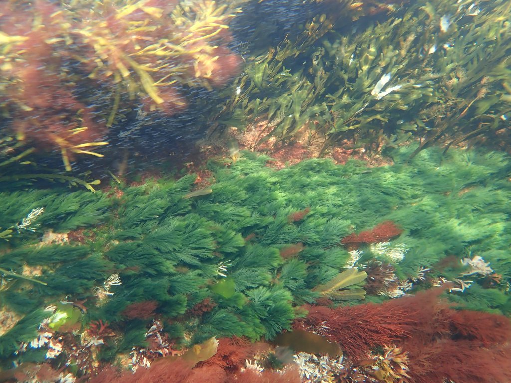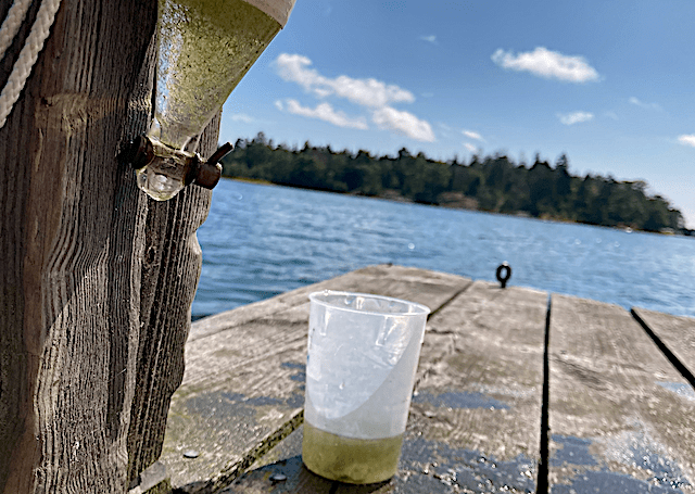 Alldeles vid den stora hamnen i Kapellskär finns en campingplats med badplats och härliga klippor där blåstången frodas. Ett första tecken på att vi närmar oss hösten syns nu. Det är att grönslicksbältet börjar någon decimeter under ytan. Det beror på att vattenståndet har stigit sedan grönslickens sporer satte sig fast strax under vattenlinjen i juni när det var högtryck. Nu när höstens lågtryck kommer in, stiger vattnet och grönslicksbältet hamnar djupare.