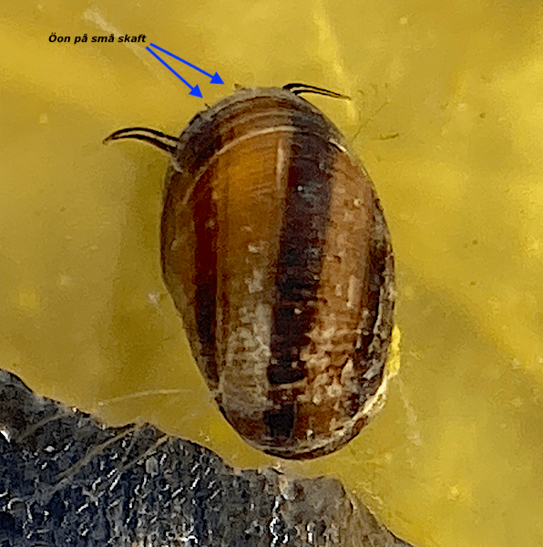 Visst har oval dammsnäcka också fina små ögon? Men vad ser den när den kryper runt på botten eller en tångplanta? Måste ju vara det som är rakt ovanför, eller kan den se framåt och åt sidorna också? Andra arter som t.ex. båtsnäckor har sina ögon bokstavligt talat ”på skaft”. Enligt litteraturen sitter det välutvecklade ögon i spetsen på en kort tentakel bredvid den långa tentakeln. Det lär ge snäckorna en visuell känsla av var de rör sig. Något att undersöka närmare nästa gång Du hittar någon snäcka. Var sitter ögonen och hur rör de sina tentakler när de kryper fram över botten? Det kan vara svårt att få syn på båtsnäckornas ögon. Mycket lättare att kolla på en stor strandsnäcka, Littorina littorea eller en landsnäcka, t.ex. vinbergssnäcka eller trädgårdssnäcka.