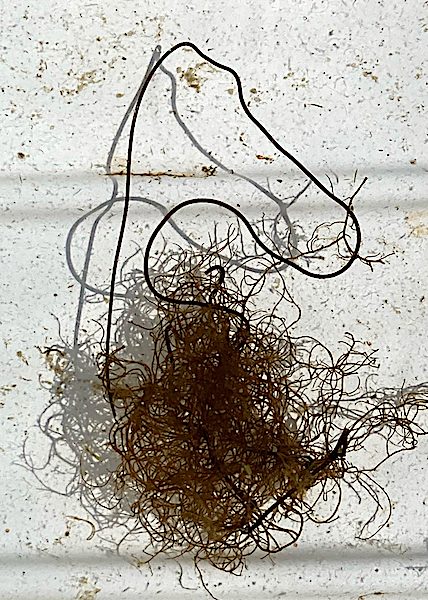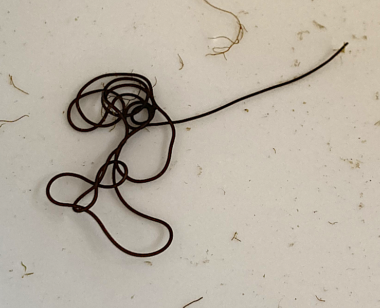 Det visade sig vara en tagelmask, Gordius aquaticus som kan bli 12-35 cm lång. Tagelmaskar är skildkönade och lever fritt i vattnet som den som jag hittade. Som vuxna äter de inget och har varken mun eller analöppning. Den jag hittade var antagligen en hona för hanar känner man igen på att svansändan är kluven i två delar. Tagelmasken har en mycket underlig livscykel. En kortversion är att ur ägget kläcks en liten larv som först simmar runt i vattnet, hittar en vatteninsekt, helst en dykarskalbagge av släktet, Dysticus som blir dess värddjur. När den utvecklats till en nästan könsmogen tagelmask borrar den sig ut genom huden på skalbaggen. Vill du veta mer om den komplicerade livscykeln eller tagelmaskar i allmänhet så har Naturhistoriska Riksmuseet bra information här.
