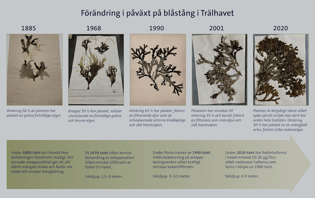 Genom undersökningar av herbarierna kunde vi visa att övergödningen från Stockholm, där orenat avloppsvatten spridits ut i skärgården under lång tid, resulterade i att den innersta gränsen för blåstång flyttade längre och längre ut. Under 1970- och 80-talet gjordes stora insatser för att rena vattnet och vid återbesök 2020 är nu tången tillbaka långt in i Trälhavet. Våra resultat visar att när vi gör åtgärder som minskar tillförseln av näring i ett skärgårdsområde kan blåstången komma tillbaka av sig själv.