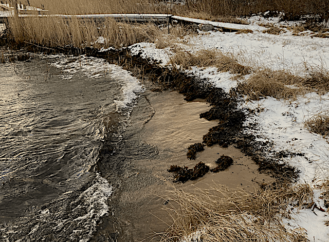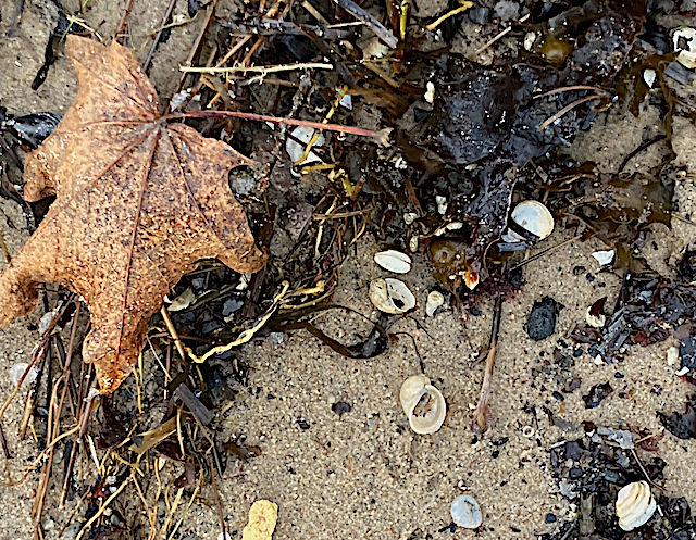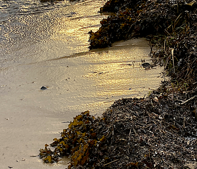 Idag går vågorna höga och slår in över klipporna. Vid stranden ligger en liten tångvall och några små frusna tångplantor glänser i solen. De har fått en tunn blank yta av is eftersom det är några grader minus i luften.