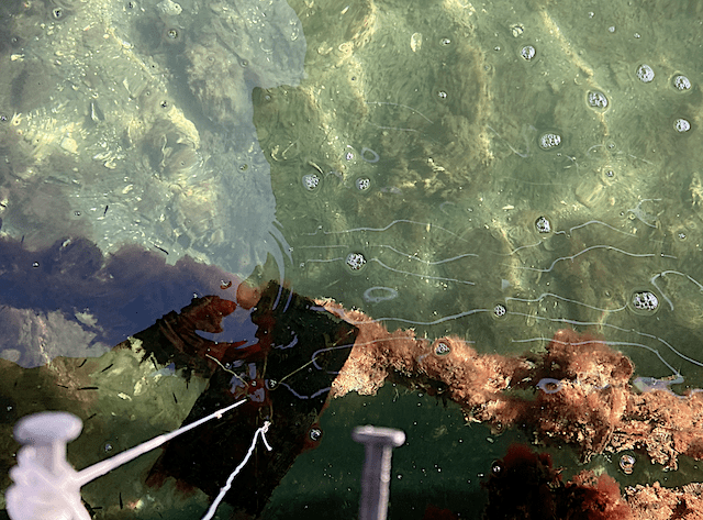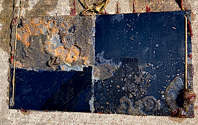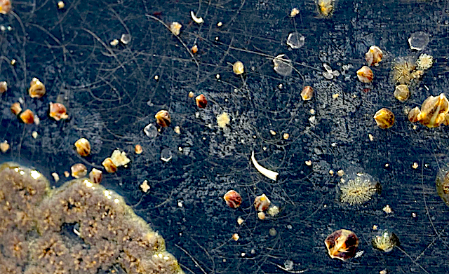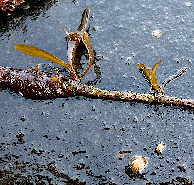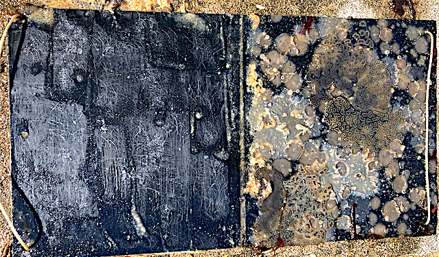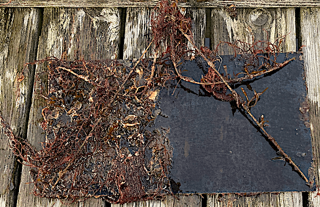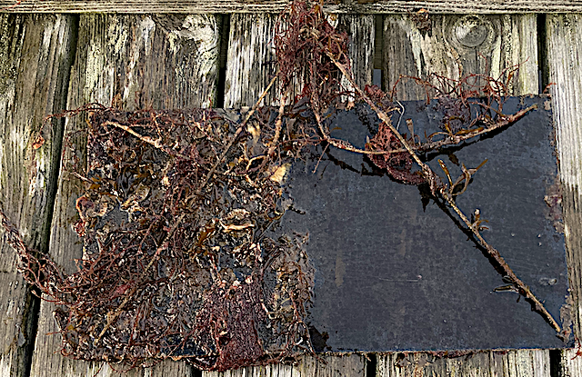 En fundering som jag fick är vad som kommer att hända om groddplantorna till Sargassosnärja (Sargassum muticum) överlever och växer till stora plantor nästa sommar. De kommer nog att täcka hela plattan och tynga ner den. Det växte minst tre arter av rödalger på plattan, ullsläke, Ceramium tenuicorne, någon art av Polysiphonia spp. och gaffeldun, Callithamnion corymbosum. Plattan börjar bli riktigt artrik med fyra arter av makroalger och sju ryggradslösa djurarter. Totalt 10 makroskopiska fastsittande arter och många, många fler mikroskopiska arter. Ett helt lite ekosystem.