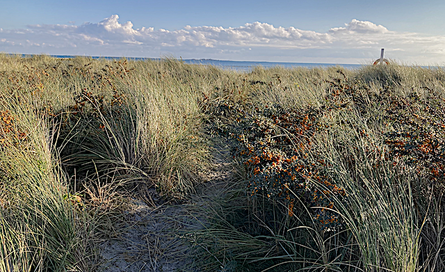 Stränderna i Danmark gömmer sig ofta bakom en sanddyn. Gör att man blir extra nyfiken på hur det kan se ut på andra sidan. På dynen vid Fredrikshamn växte strandråg (Leymus arenarius) och havtorn (Hippophaë rhamnoides).