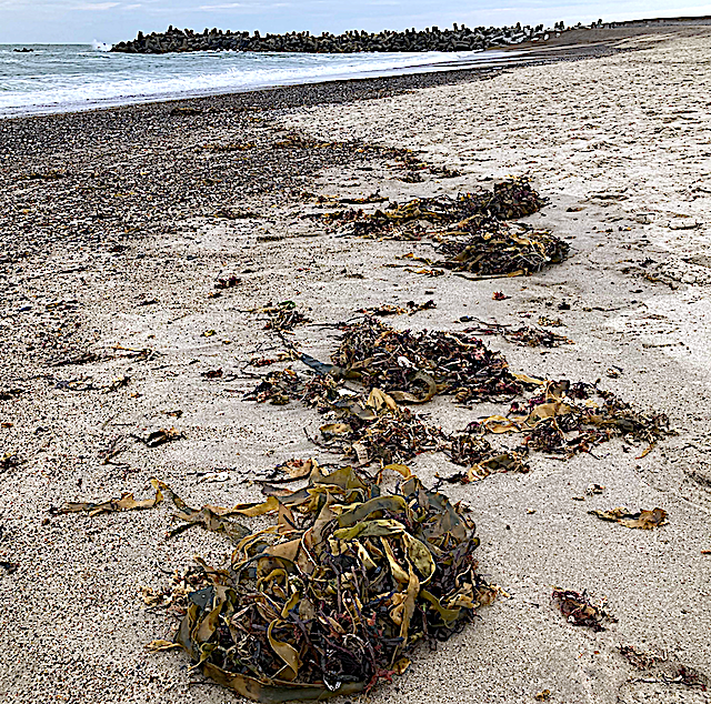 Längst bort från den stora konstgjorda piren låg det stora torra buntar med ålgräs (Zostera marina). Det ska ha använts som isolering i hus förr i tiden. Lite närmare piren och en bit högre upp på stranden hade det istället samlats buntar med fingertare, (Laminaria digitata). Det gillar vi!