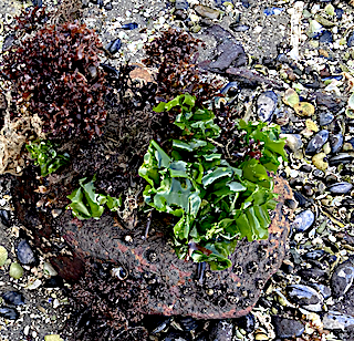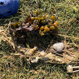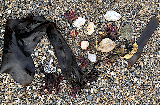 Glasört, havssallat och lite gammal blåstång.Blåstång med förökningstoppar, ett krabbskal och vitgul havssallat.